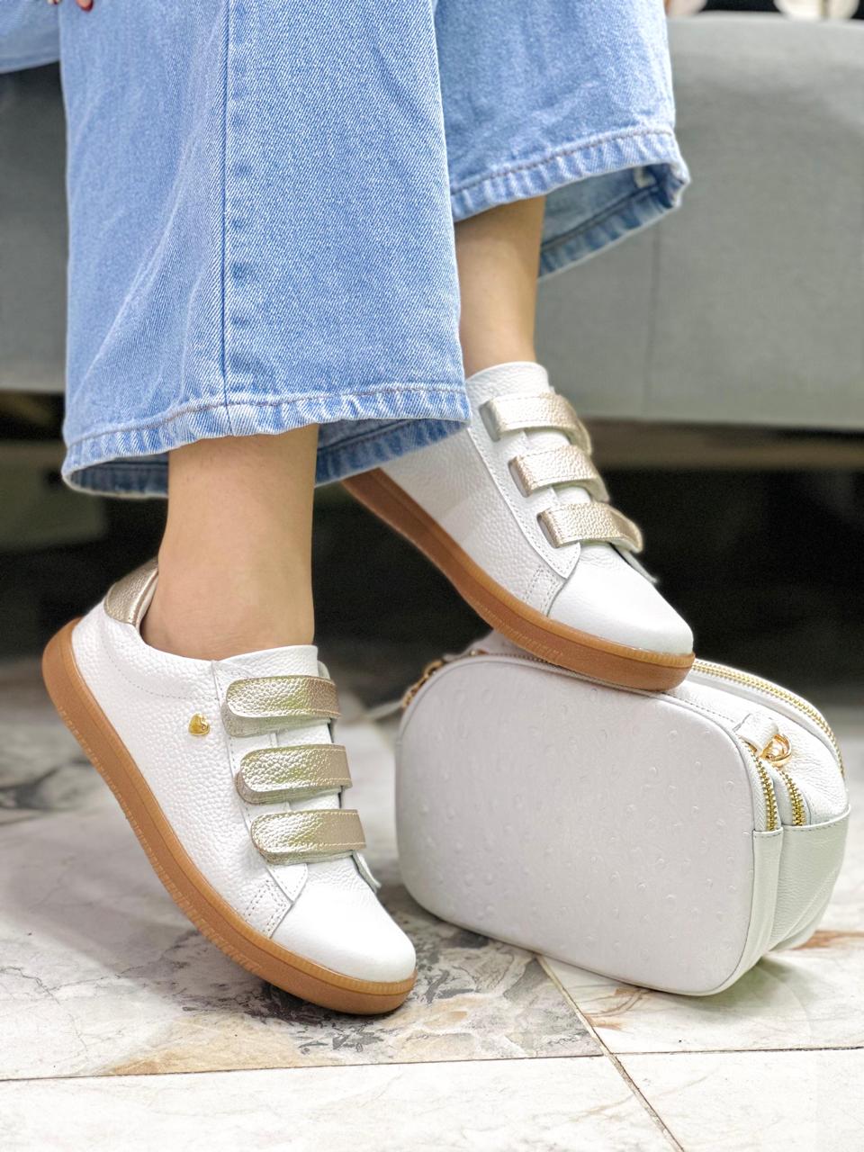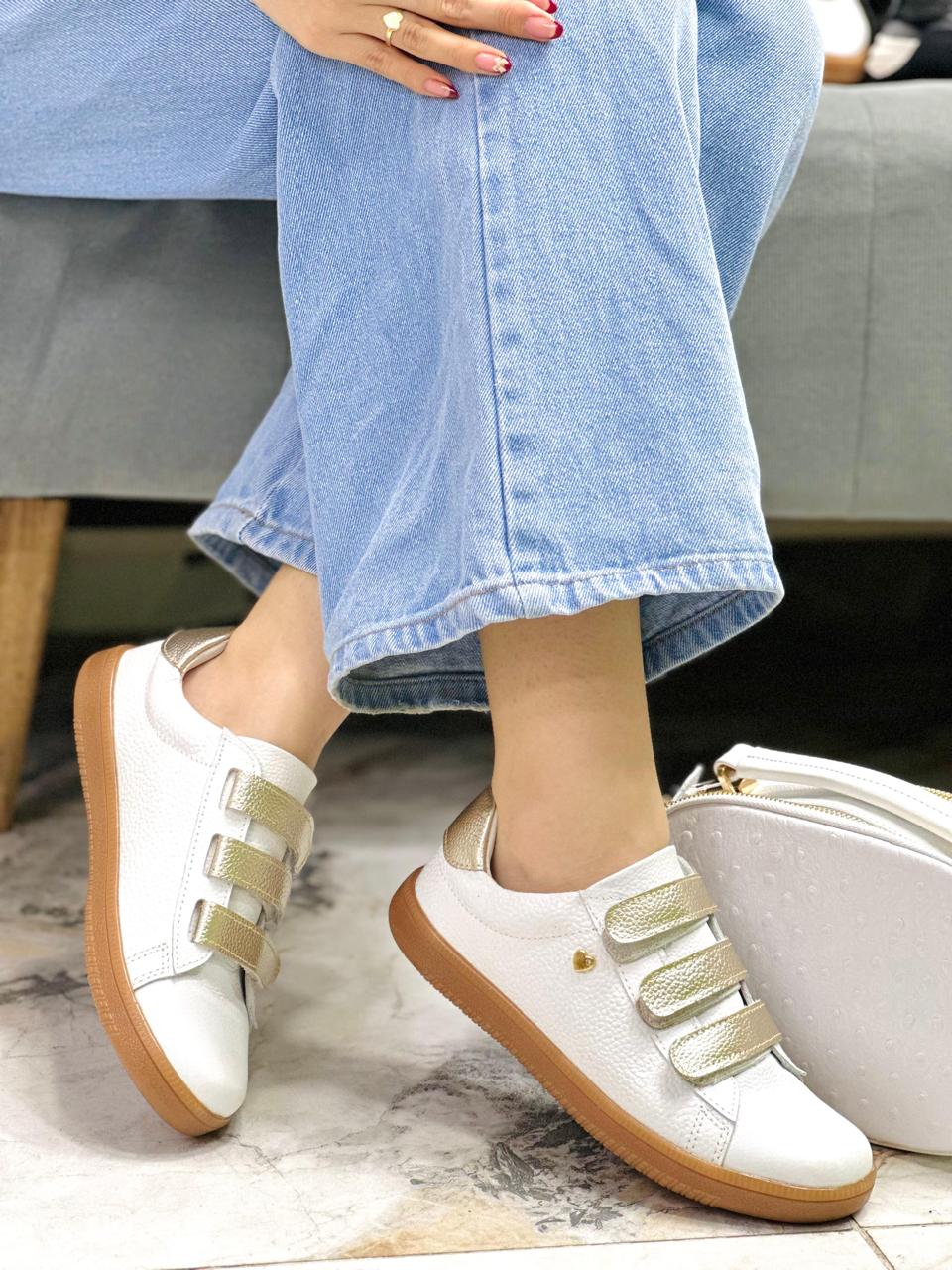 Los tenis Abril blanco x dorado combinan elegancia y comodidad en un diseño moderno y versátil. Están confeccionados en cuero de color blanco, con una textura suave que aporta un acabado limpio y sofisticado. Incorporan tres correas de velcro en tono dorado metálico, que no solo facilitan el ajuste, sino que añaden un toque chic y femenino al diseño.