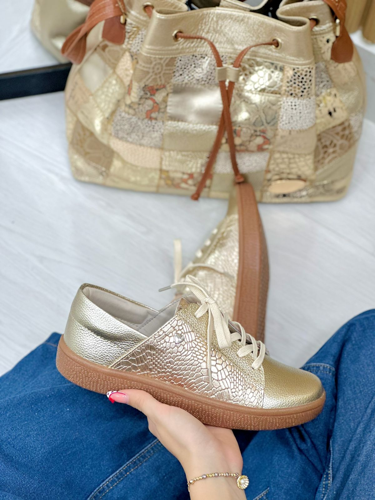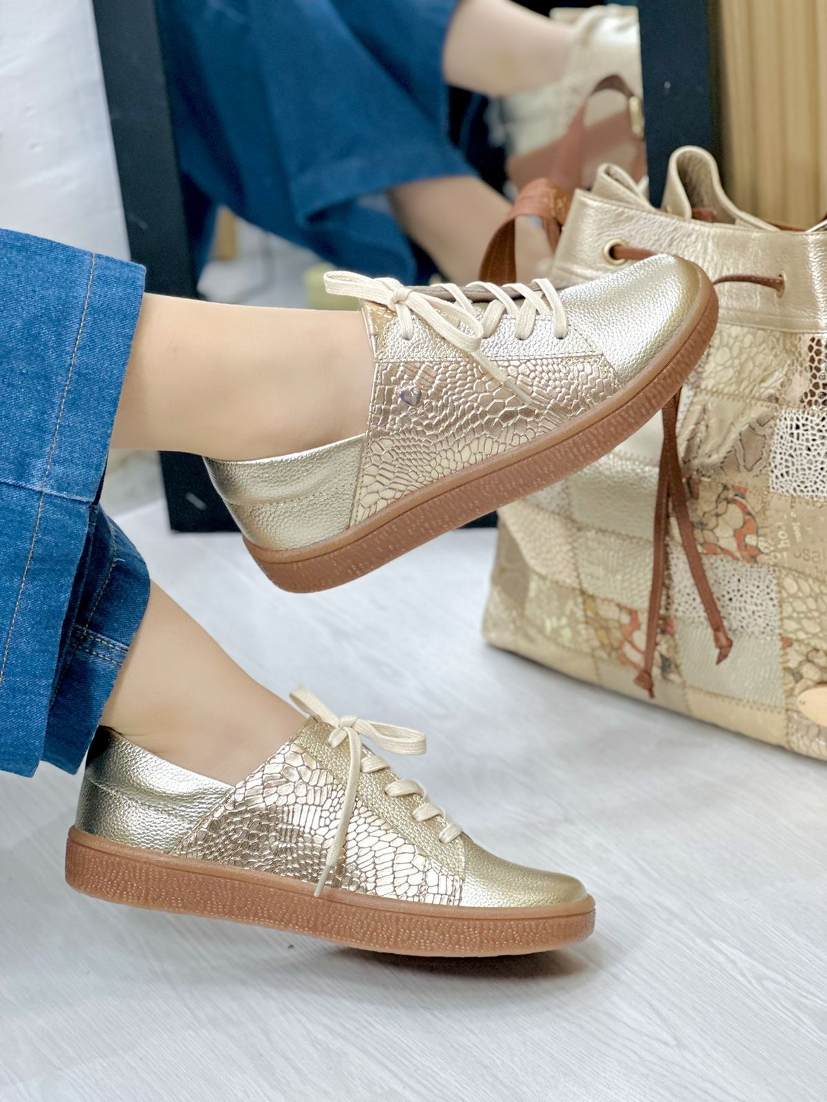 Los tenis Alicia están elaborados 100% en cuero Baltimore de tono Dorado versátil que combina con cualquier look. Su diseño con cordones y suela baja en color café resalta un estilo moderno y práctico, ideal para usar a diario sin perder elegancia. Un calzado ligero, cómodo y atemporal, perfecto para quienes buscan calidad, durabilidad y un diseño exclusivo en cuero.