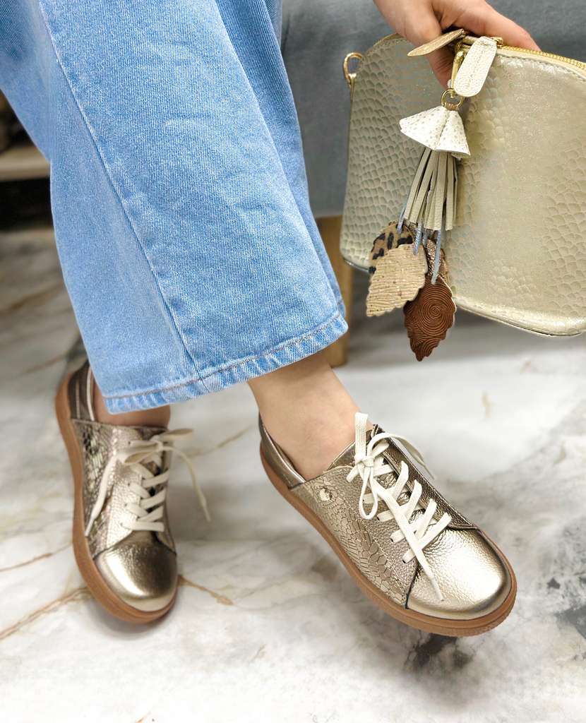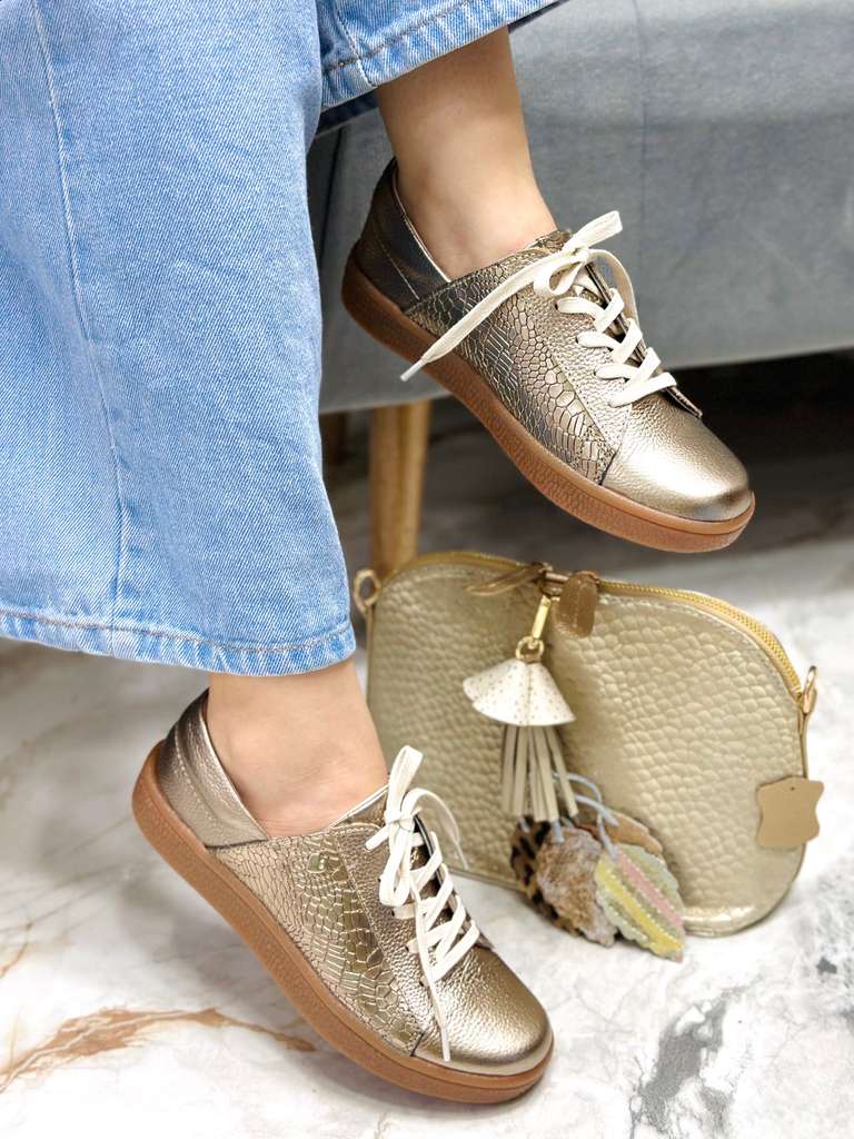 Los tenis Alicia están elaborados 100% en cuero Baltimore de tono Luna versátil que combina con cualquier look. Su diseño con cordones en color crema y suela baja en color café resalta un estilo moderno y práctico, ideal para usar a diario sin perder elegancia. Un calzado ligero, cómodo y atemporal, perfecto para quienes buscan calidad, durabilidad y un diseño exclusivo en cuero.