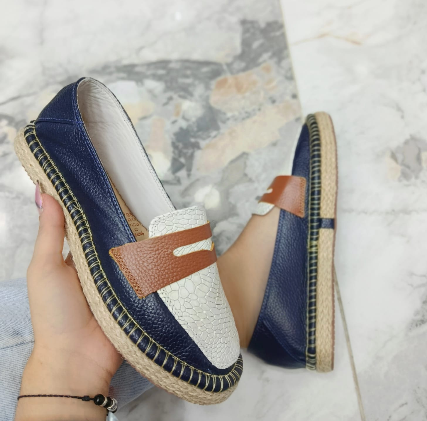 Alpargatas Blake elaboradas en cuero de excelente calidad, que combinan de manera armoniosa el brillo del Azul con la frescura del tono talco y miel. Su diseño artesanal incorpora una suela tipo yute que aporta comodidad y un aire veraniego, mientras que los acabados detallados y la mezcla de texturas elevan su estilo, convirtiéndolas en el complemento perfecto para outfits casuales o elegantes durante cualquier temporada.