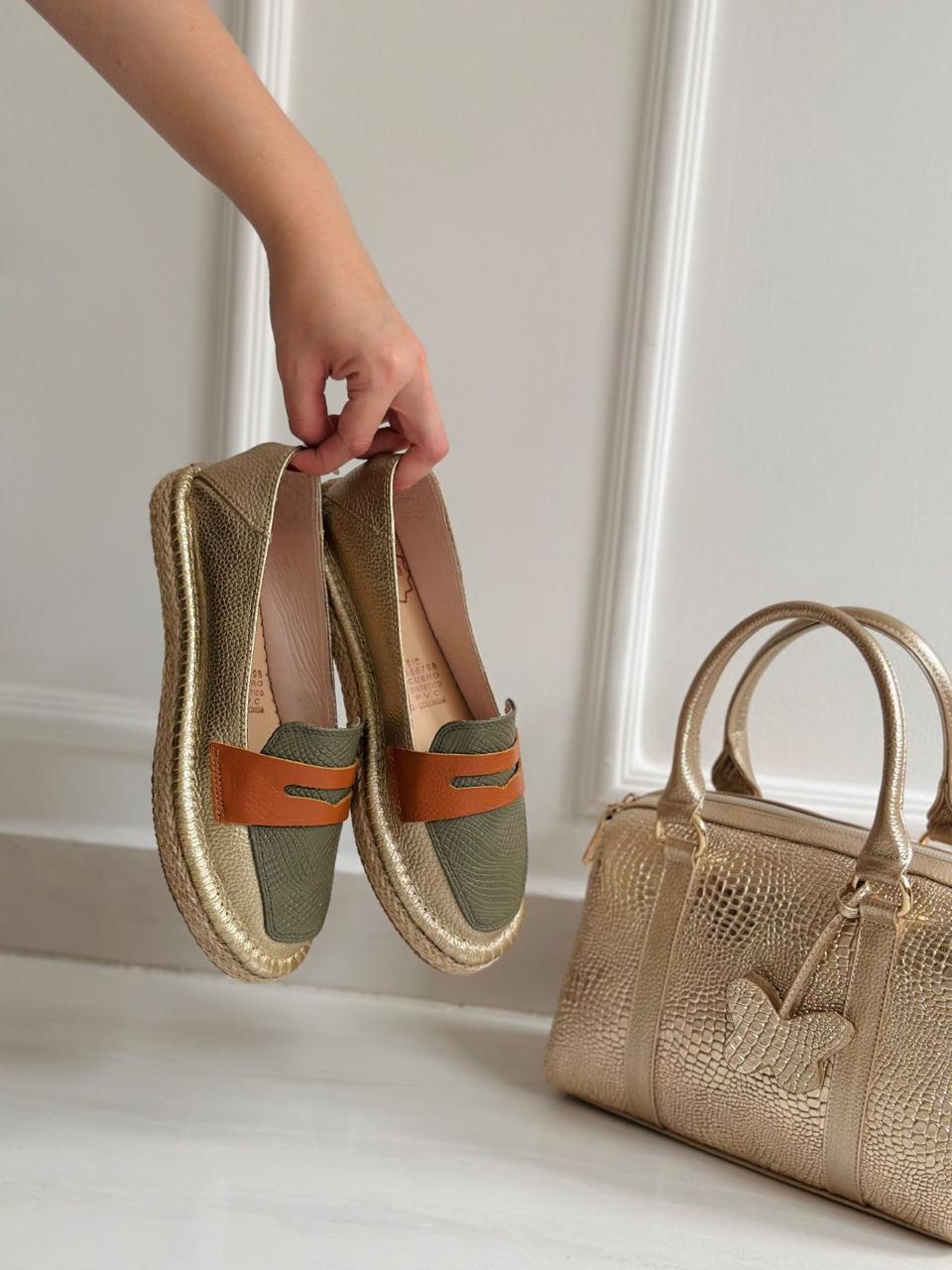 Alpargatas Blake elaboradas en cuero de excelente calidad, que combinan de manera armoniosa el brillo del dorado con la frescura del verde y el toque cálido del miel. Su diseño artesanal incorpora una suela tipo yute que aporta comodidad y un aire veraniego, mientras que los acabados detallados y la mezcla de texturas elevan su estilo, convirtiéndolas en el complemento perfecto para outfits casuales o elegantes durante cualquier temporada.