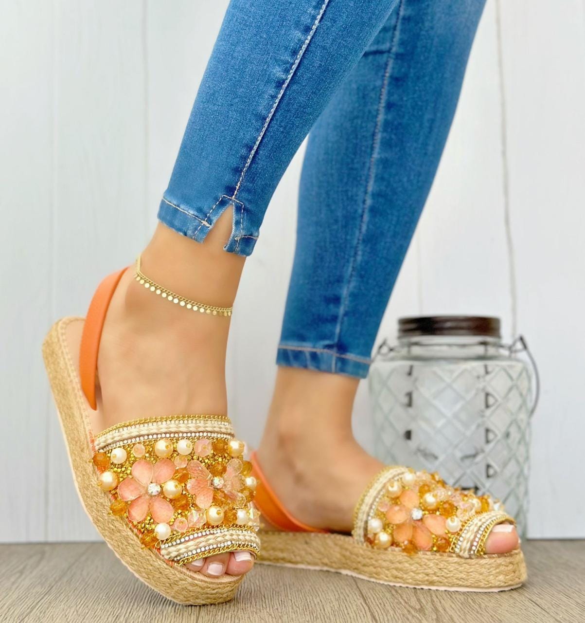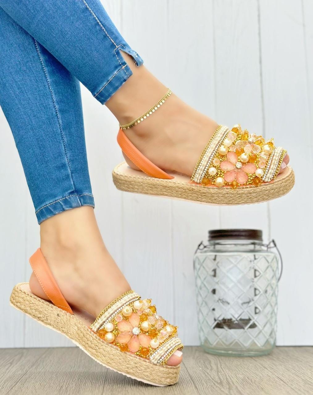 Descubre la elegancia de los Alpargata Color Piedras Naranjas en un sofisticado color Naranja. Este color profundo es versátil y complementa a la perfección cualquier outfit, desde looks casuales hasta formales. El acabado  resalta el tono original del cuero, brindándole un brillo sutil que destaca sin esfuerzo. estos Tacones ofrecen una altura cómoda que realza tu figura sin sacrificar el confort. Aseguran un ajuste perfecto para una postura óptima y una caminata segura.