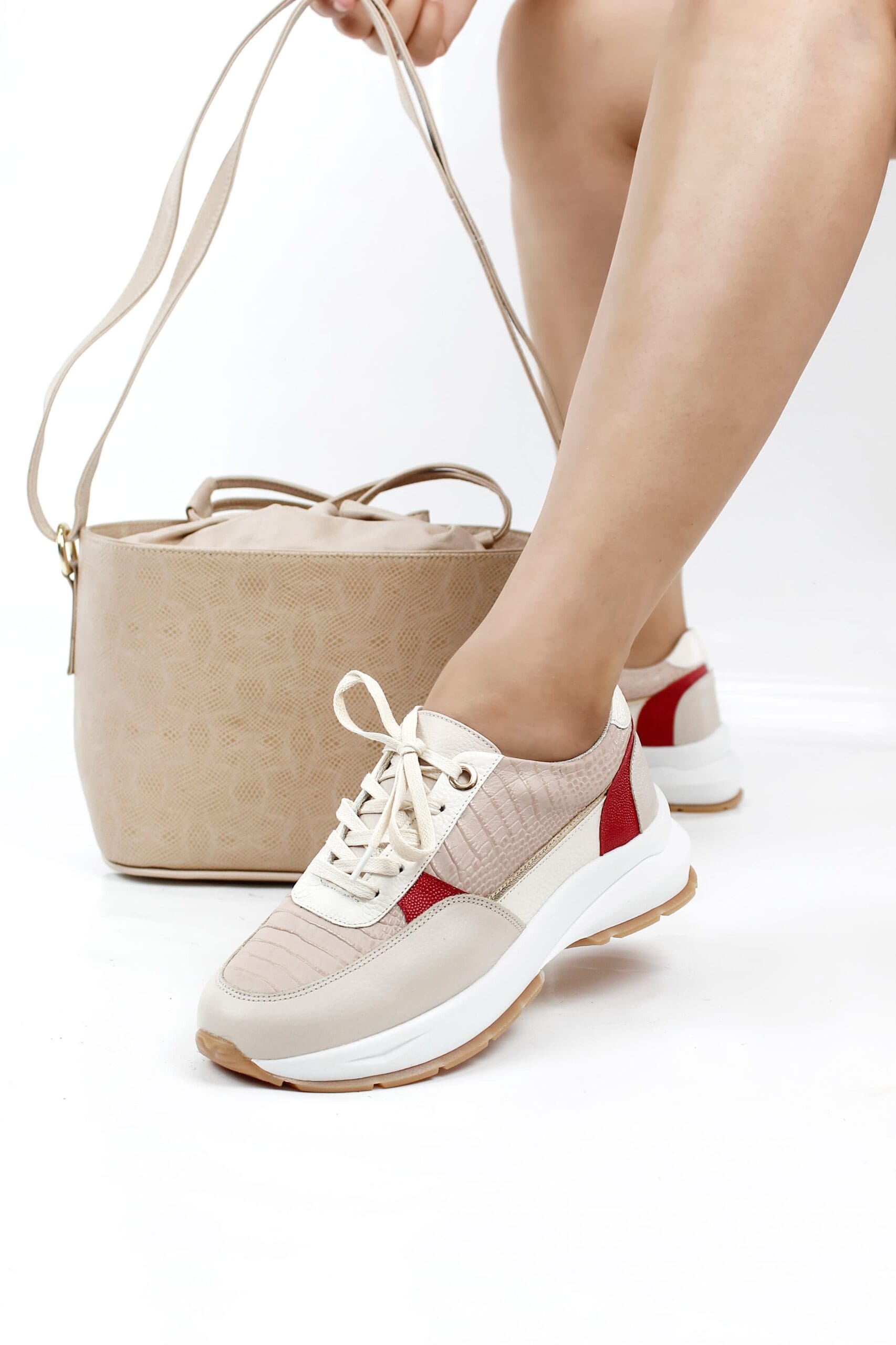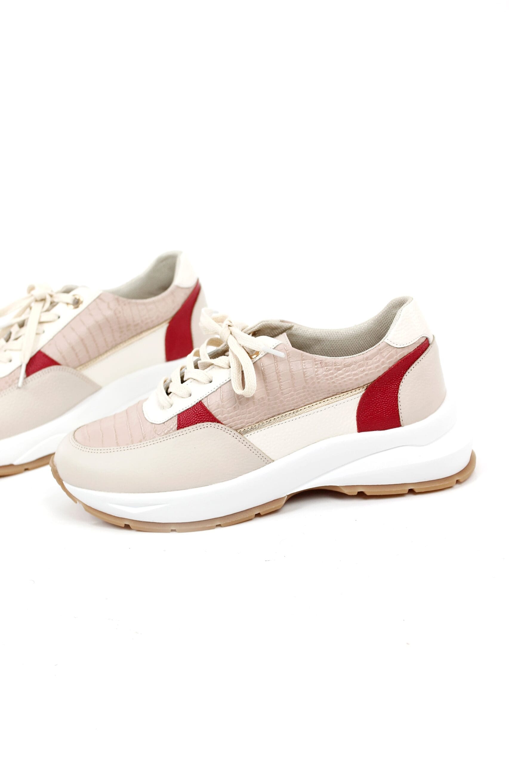 Los tenis Brilho destacan por su diseño elegante y versátil. Presentan un suave color talco que se combina a la perfección con detalles dorados en los rojos y nude, aportando un toque de sofisticación. La folia nude añade un toque original y moderno al diseño. En su interior, están equipados con espuma sintética y una plantilla confort que proporciona una mayor amortiguación, haciendo que sean increíblemente cómodos para el uso diario.