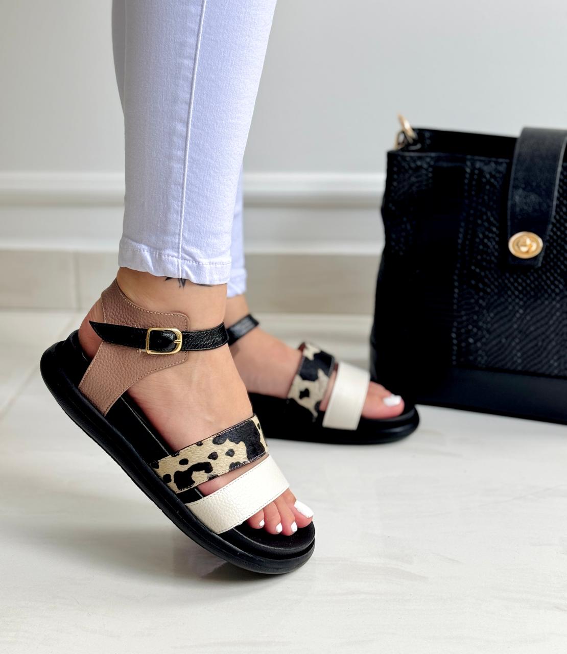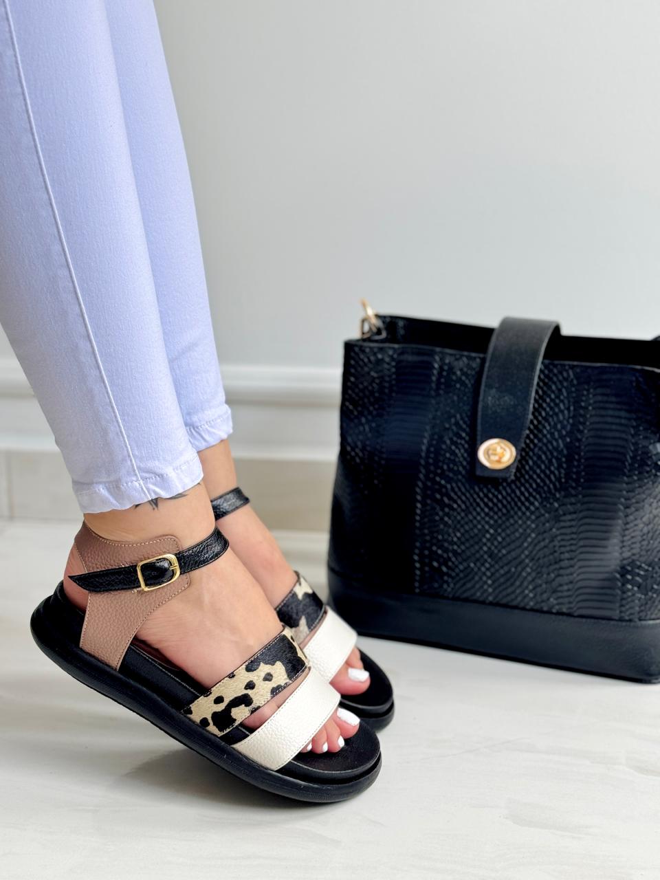 Canoa femenina elaborada en cuero natural, diseñada con una fusión de texturas y colores que destacan por su estilo moderno y versátil. El diseño incorpora una faja frontal en cuero talco graneado que aporta luminosidad, acompañada de una segunda faja central en cuero tipo estampado animal print, que añade un toque audaz y contemporáneo. La parte trasera está confeccionada en cuero taupe, suave al tacto, mientras que la correa en el tobillo, en cuero negro con hebilla metálica dorada, brinda ajuste y seguridad. Su plantilla acolchada en tono nude garantiza comodidad, y su suela negra en goma antideslizante completa un calzado ideal para el uso diario, combinando elegancia y funcionalidad.