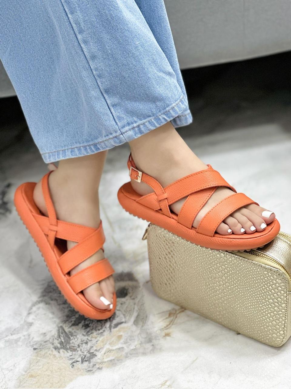 Sandalia estilo canoa elaborada en cuero genuino color Naranja, con acabado liso y suave al tacto que aporta un aire sofisticado. Su diseño práctico incluye tres tiras anchas que abrazan el empeine, garantizando un ajuste cómodo y firme. La suela del mismo color  ofrece una pisada ligera y estable, ideal para el uso diario. El interior está suavemente forrado para mayor confort. Perfecta para un look casual con estilo, especialmente cuando se combina con accesorios en tonos similares o contrastantes.