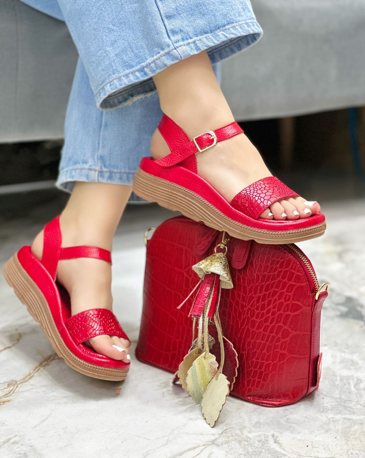 La plataforma es de tono natural, con una base firme que ofrece estabilidad y confort para el uso diario, sin perder estilo. El color rojo intenso resalta y las convierte en un calzado llamativo, ideal para combinar tanto con looks casuales como más arreglados.