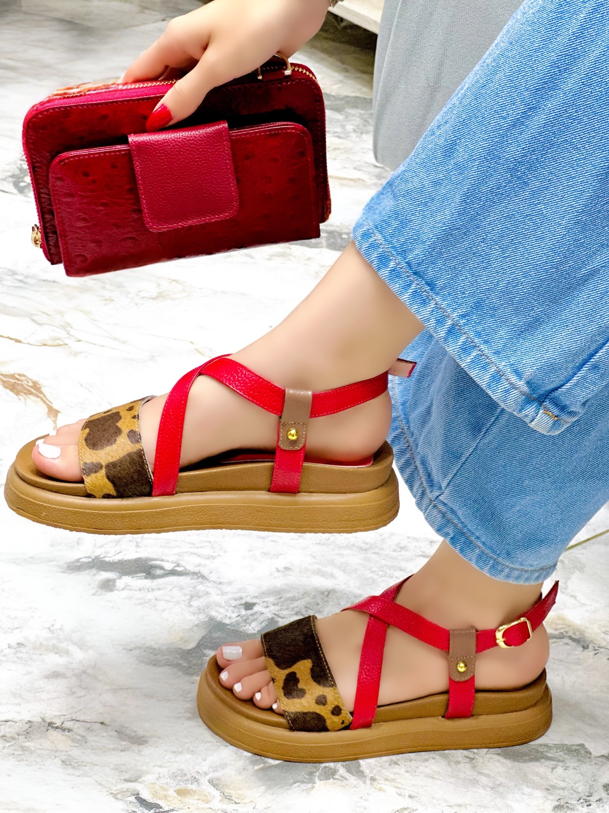 Descubre las sandalias canoas Perla en cuero rojo, un diseño que combina estilo y comodidad. Su print animal en tono miel con pintas café crea un contraste perfecto con las tiras rojas, aportando un look moderno, atrevido y lleno de personalidad. Son súper cómodas para el día a día, ideales para complementar tus outfits casuales con un toque único y sofisticado.
