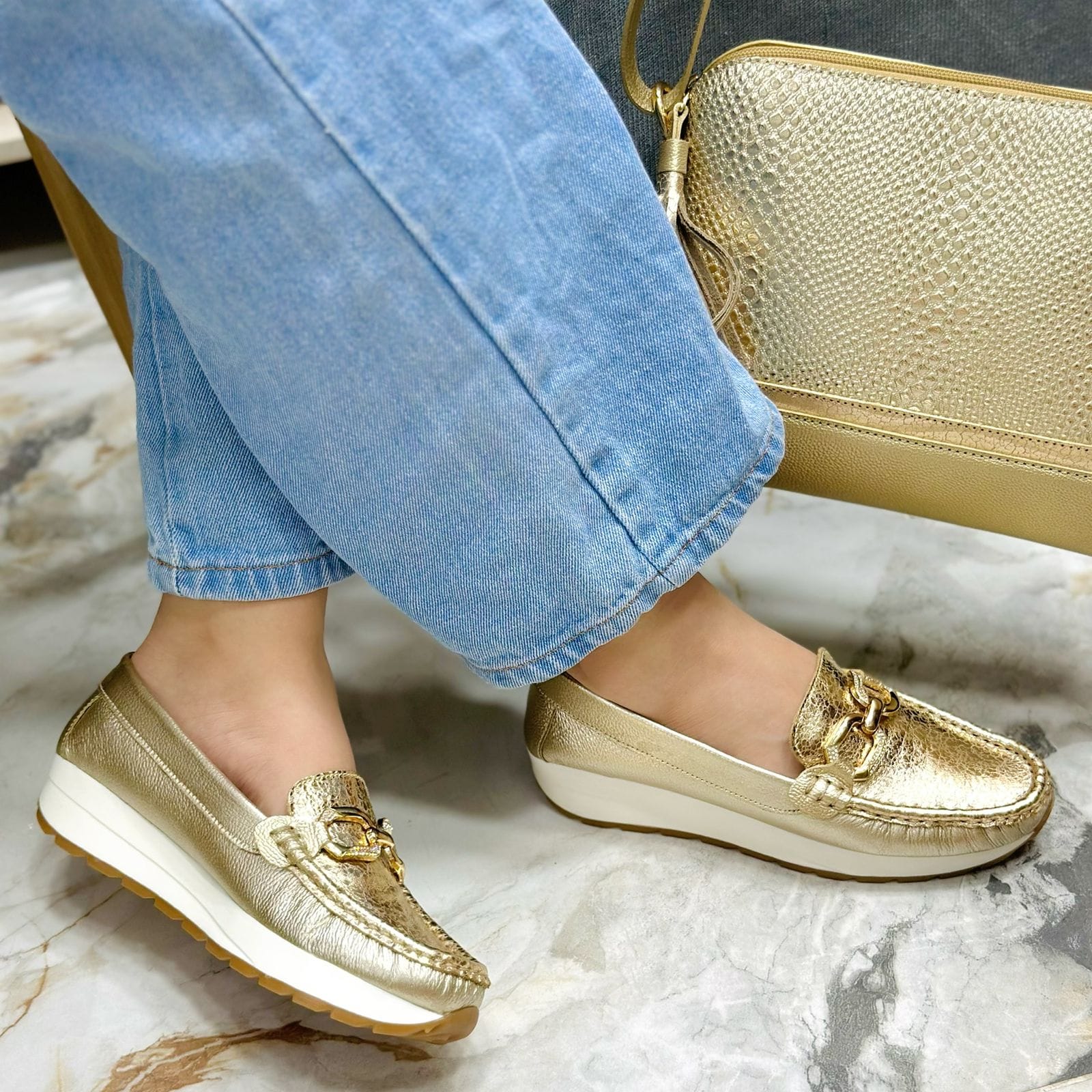 Dale un toque de lujo y sofisticación a tu outfit con los mocasines Elizabeth en cuero metalizado dorado. Su diseño moderno y brillante no solo resalta por su acabado elegante, sino también por su comodidad excepcional gracias a una suela blanca con plataforma que estiliza sin sacrificar confort. El herraje dorado en el empeine añade un detalle refinado que eleva cualquier look, desde jeans hasta conjuntos más formales. Son la elección perfecta para mujeres que quieren brillar en su día a día sin dejar de sentirse cómodas y seguras al caminar.