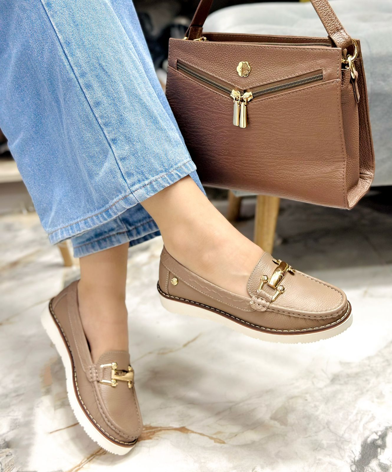 Los mocasines Naytiri combinan elegancia y comodidad en cada paso. Fabricados en cuero Taupe de textura sofisticada, ofrecen un diseño moderno con acabados de alta calidad. Su detalle metálico dorado en la parte frontal añade un toque de distinción y estilo, ideal para cualquier ocasión.