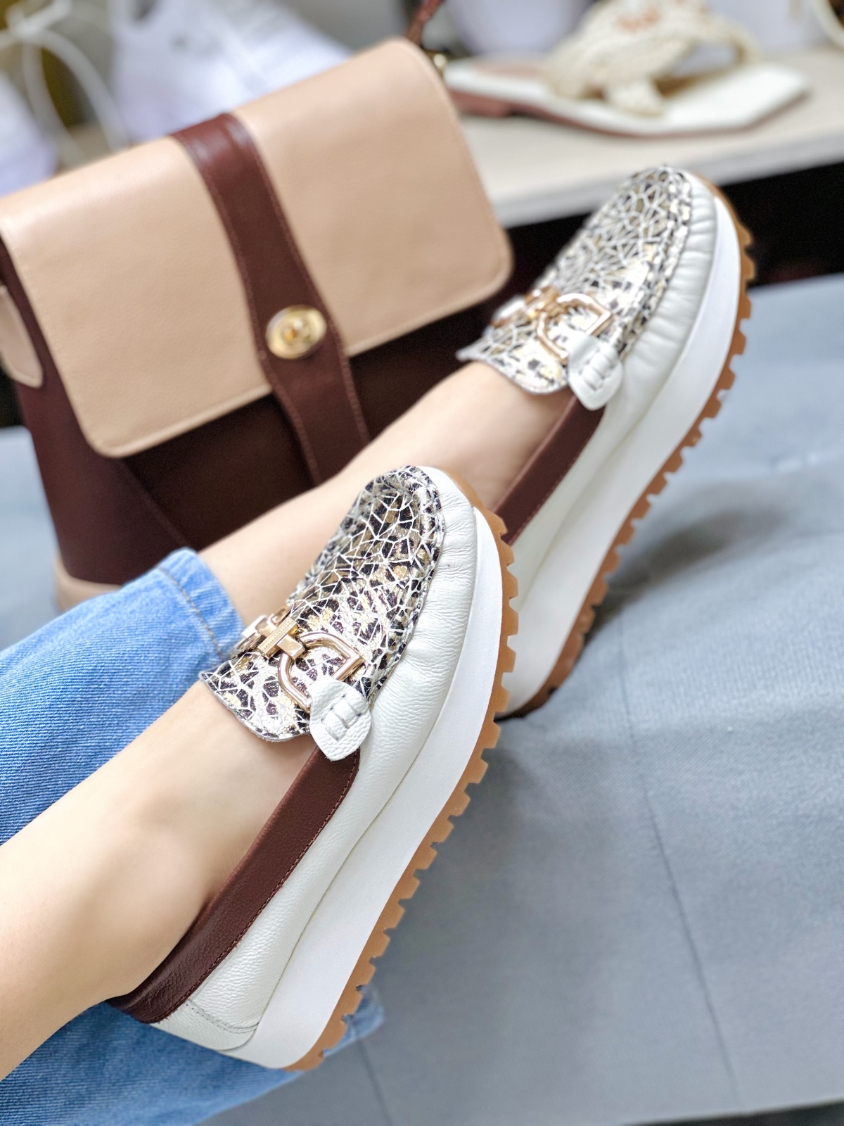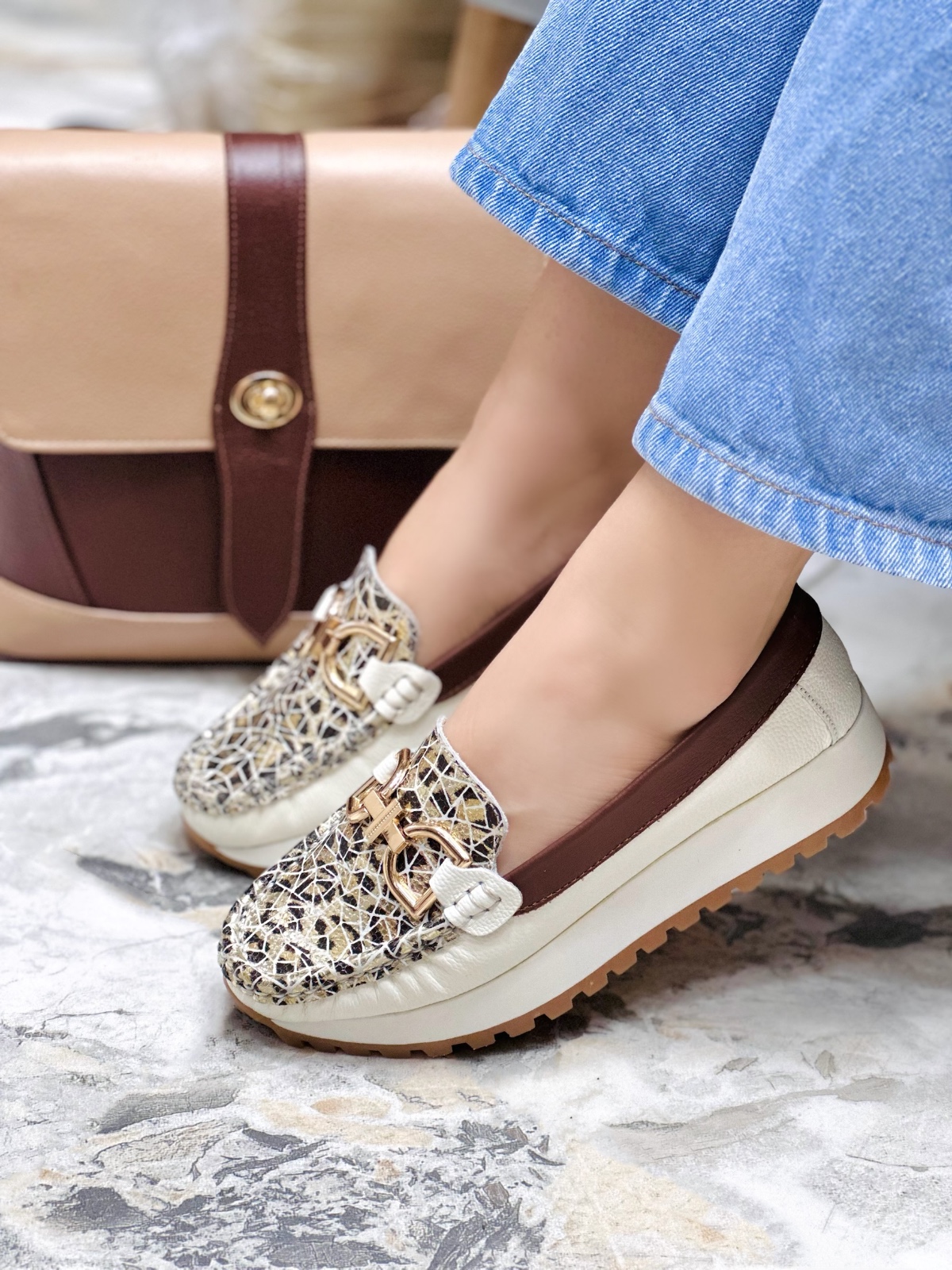 Mocasines Samara elaborados en cuero talco de alta calidad, combinando tonos talco y chocolate que realzan su elegancia y versatilidad. La capellada con folia metalizada y herraje dorado aporta un toque moderno y sofisticado, mientras que su suela ligera y cómoda asegura máxima frescura y confort durante todo el día. Perfectos para quienes buscan un calzado exclusivo que combine estilo, distinción y practicidad en cada paso.