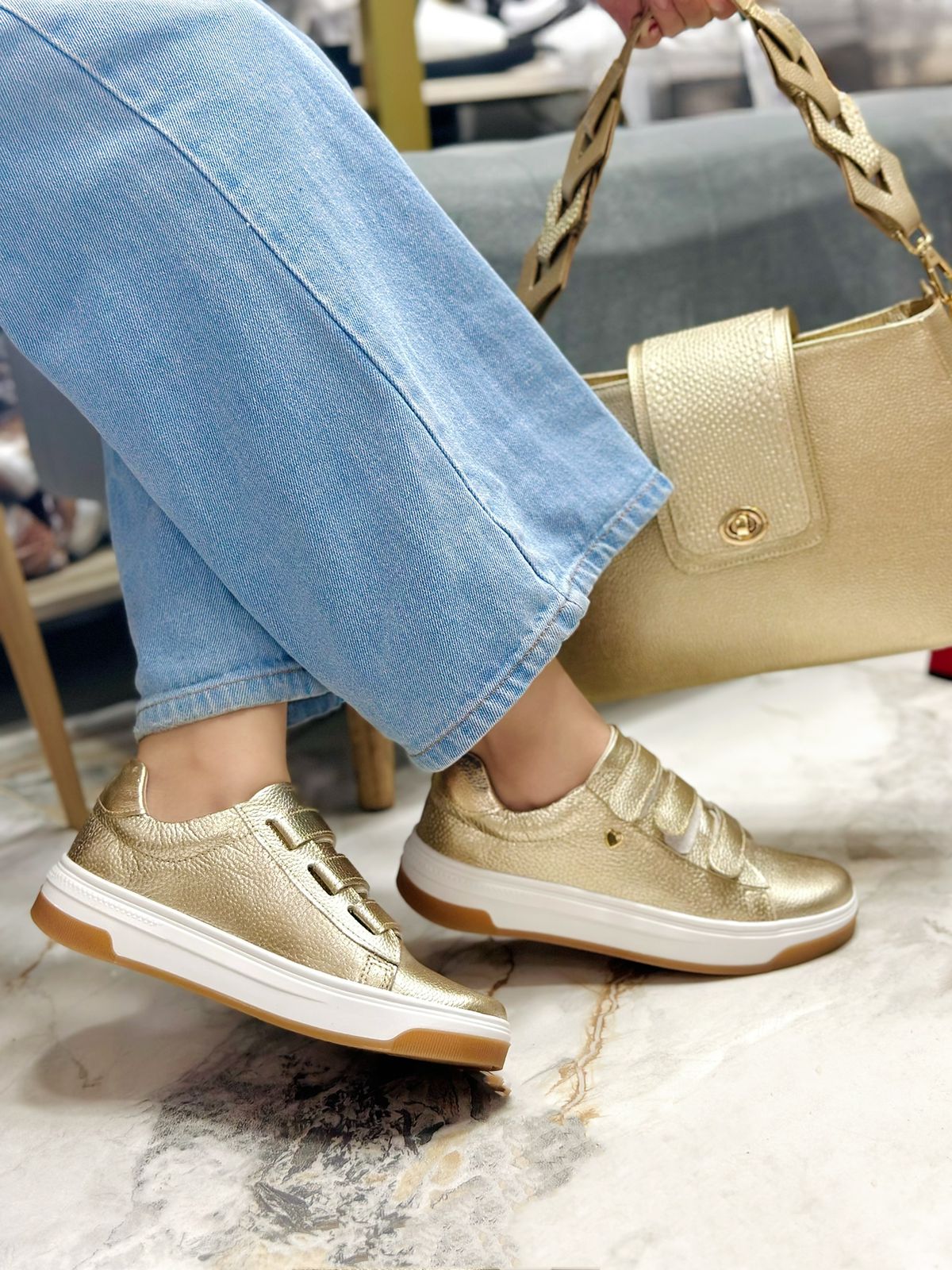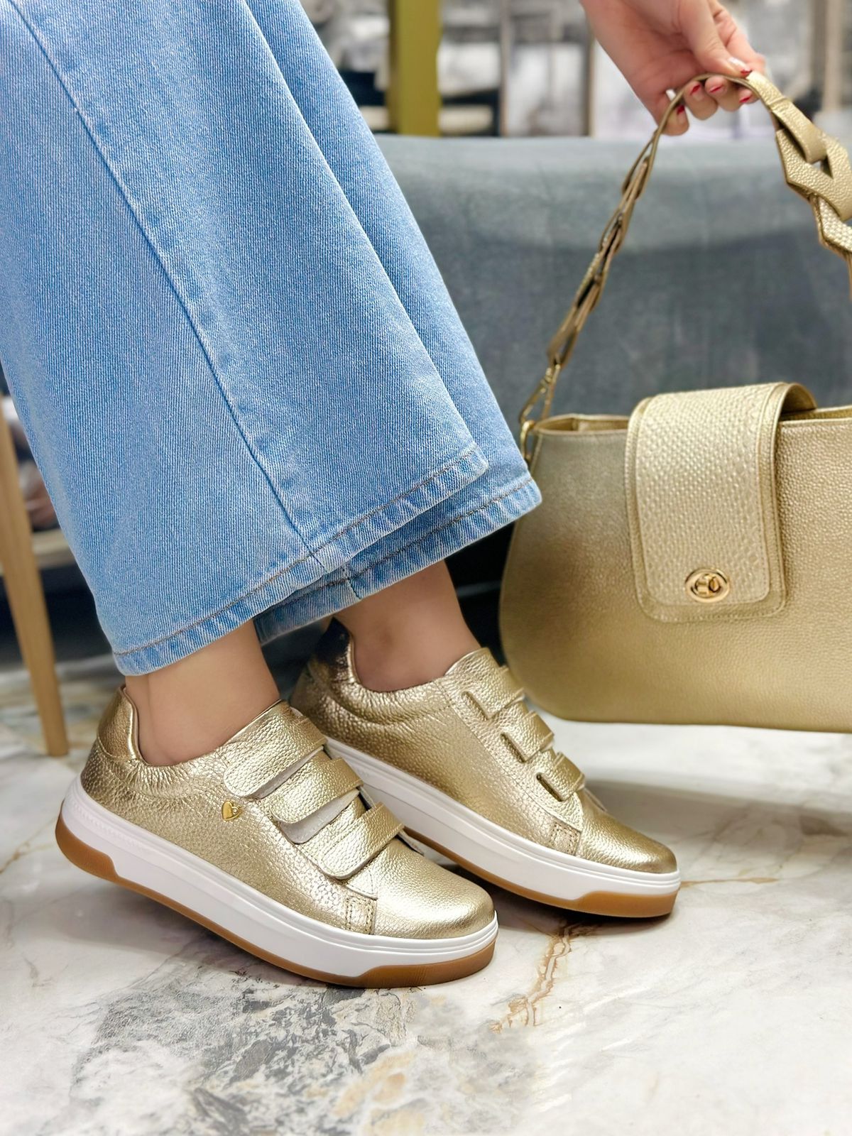 Los tenis Norah combinan practicidad y estilo en un diseño moderno y versátil. Fabricados 100% en cuero, ofrecen durabilidad y un acabado sofisticado. Su sistema de cierre en velcro permite una postura fácil y rápida, brindando comodidad en cada uso. En color blanco y dorado, se convierten en un básico infaltable que complementa cualquier look con un toque limpio y elegante