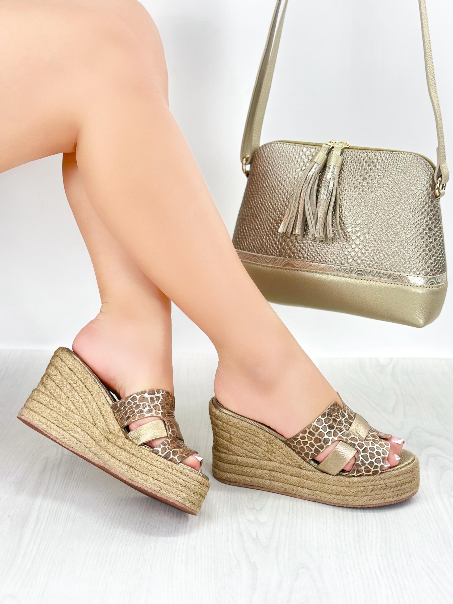 Nuestras plataformas Ambar en color Dorado y detalles en folia, destacan por su estilo y funcionalidad. Con una altura de 4 cm adelante y 9 cm atrás, están diseñadas para brindar comodidad y modernidad. Fabricadas 100% en cuero y con suela en yute natural, su diseño sin correa en la parte trasera las hace increíblemente prácticas y versátiles, ideales para cualquier ocasión.