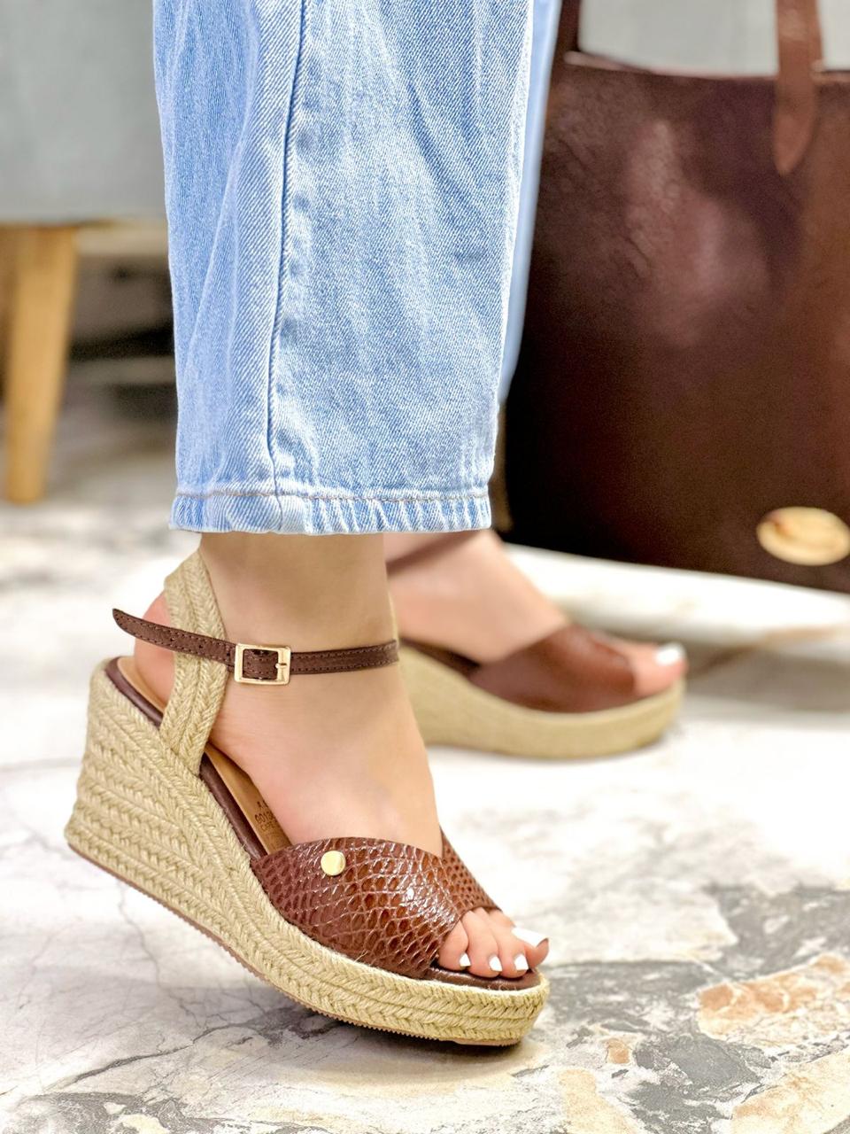 Las plataformas Mafe están elaboradas en cuero, destacando por su combinación única de colores Chocolate, que aportan un toque natural y elegante. Su diseño cerrado y la plataforma forrada en yute natural brindan un estilo fresco y versátil, ideal para cualquier ocasión. Con una altura de 7 cm en la parte trasera y 2.5 cm en la delantera, ofrecen una elevación cómoda y estable. Su correa ajustable garantiza un calce perfecto, mientras sus tonos armoniosos las convierten en el complemento ideal para resaltar tus outfits.