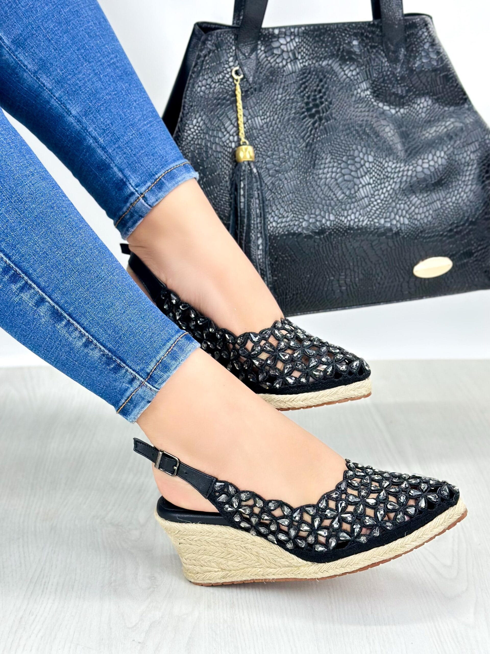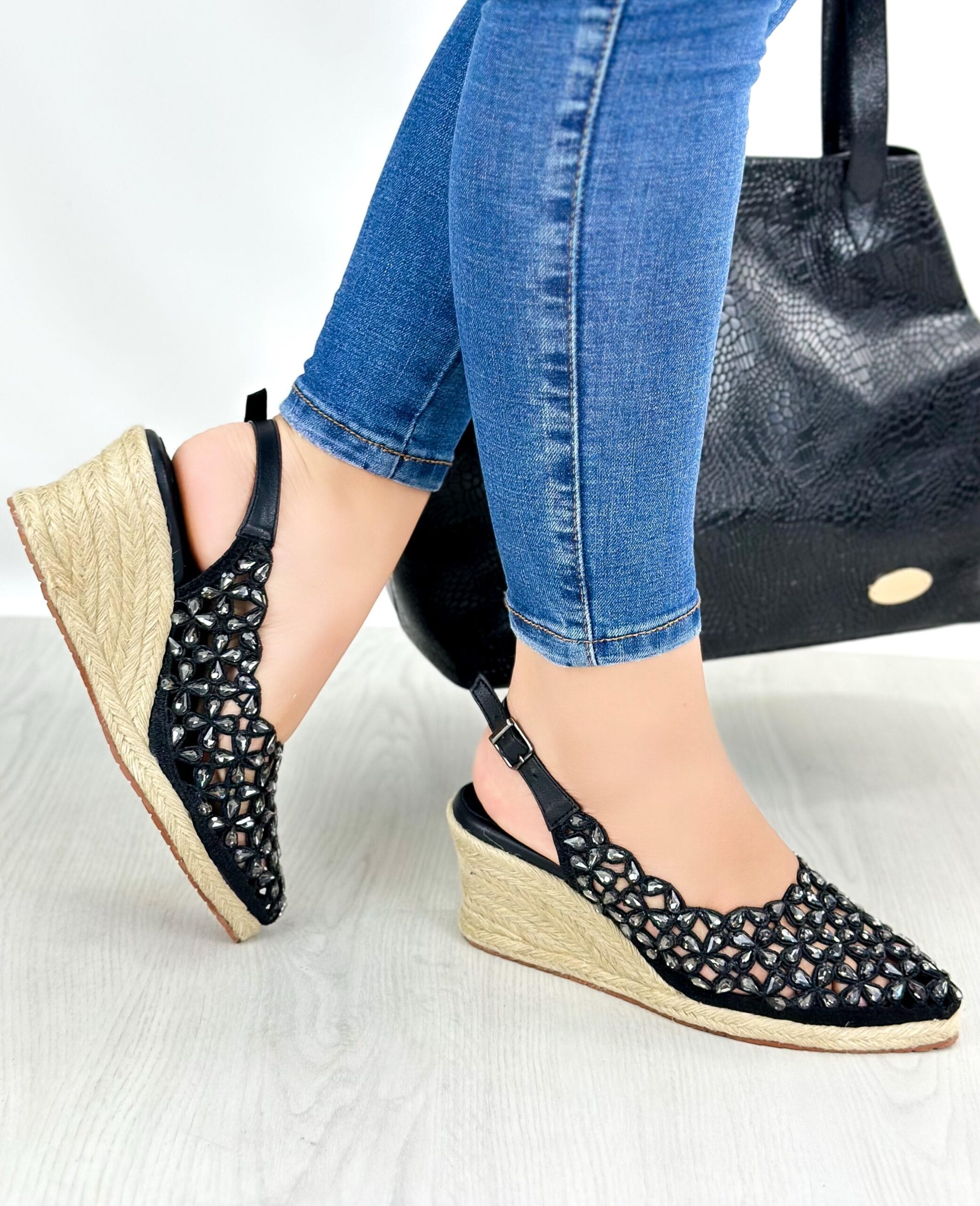 Las plataformas Mika en color negro combinan estilo y comodidad con un diseño moderno y llamativo. Su plataforma baja de altura 7.5 atrás y adelante 1 cm, fabricada en material sintético, ofrece un soporte ligero ideal para el uso diario. La capellada estilo canasta añade un toque artesanal y único, embellecida con pequeñas piedras brillantes en tono plateado que aportan un detalle elegante y femenino. El diseño versátil y sofisticado de las plataformas Mina las convierte en el complemento perfecto para elevar cualquier look.