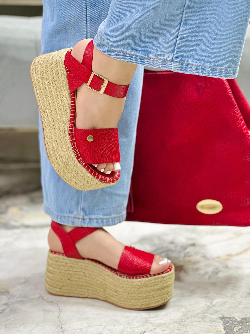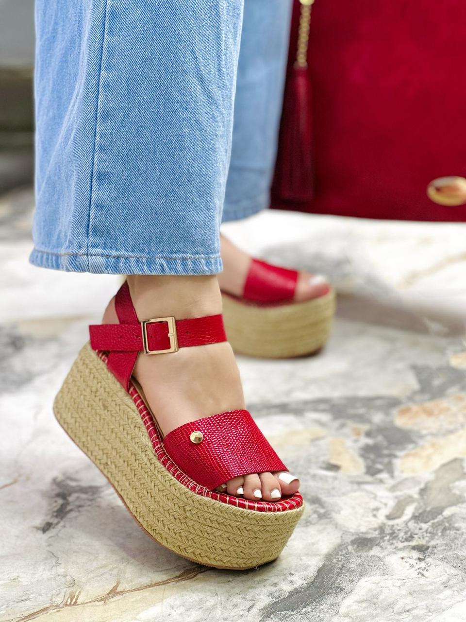 Plataformas Nicky de color Rojo fabricadas con materiales de excelente calidad que garantizan durabilidad y comodidad. Cuentan con una altura trasera de 6 cm y delantera de 4 cm, logrando el equilibrio perfecto entre estilo y confort. Su diseño con correas ajustables se adapta al pie brindando seguridad en cada paso, mientras que la suela tipo yute añade un toque fresco y versátil. Ideales para combinar con outfits casuales o elegantes, estas plataformas en cuero son el complemento perfecto para destacar tu look con un brillo sofisticado y moderno.