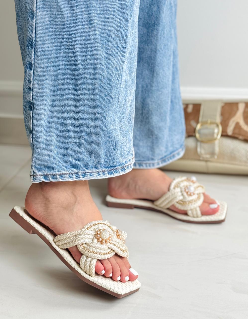 Las sandalias Noemí en perla  están elaboradas en material sintético de excelente calidad. Su diseño trenzado con detalles de perlas en la capellada aporta un estilo artesanal, fresco y elegante. Perfectas para complementar tus looks veraniegos con un toque natural y sofisticado.