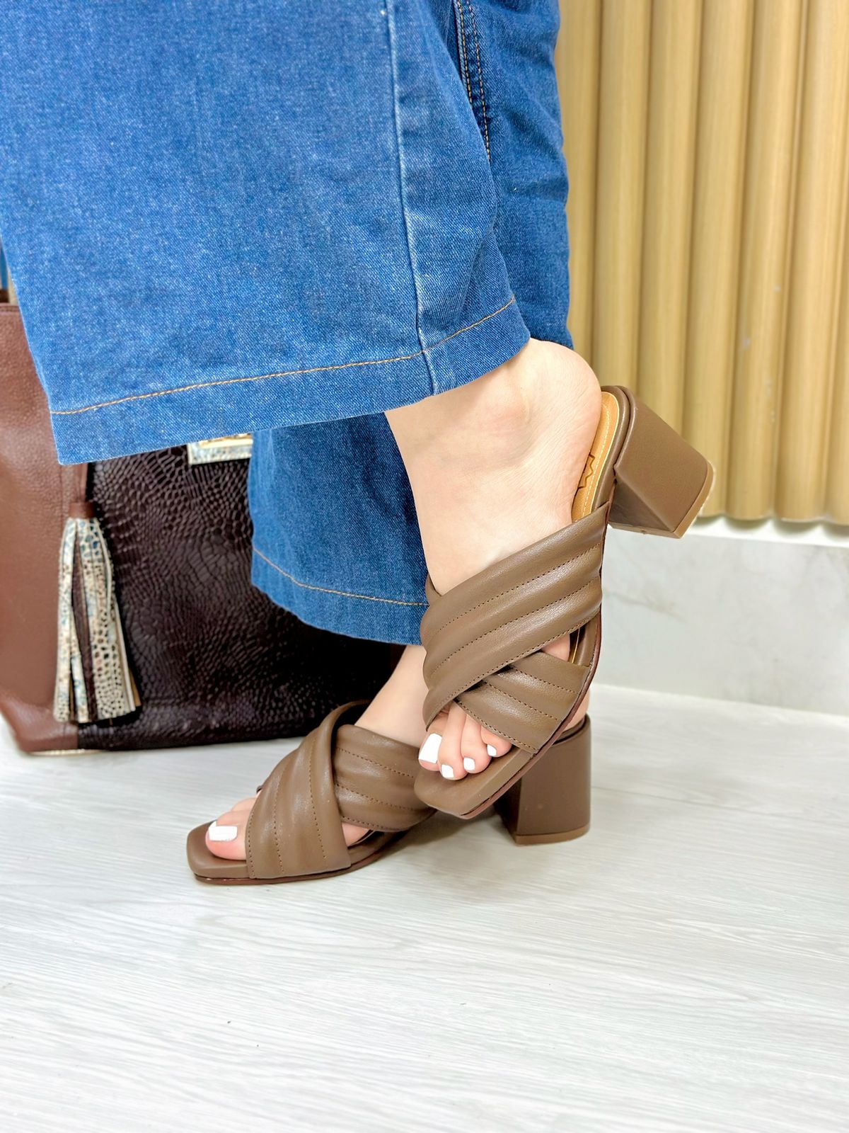 Tacones Alessandra en material sintético, diseñados para brindar estilo y comodidad en cada paso. Presentan un elegante acabado en tono Chocolatesuave que aporta frescura y versatilidad a cualquier outfit. Su diseño de tiras cruzadas acolchadas ofrece un ajuste cómodo y moderno, ideal para uso diario o ocasiones especiales.