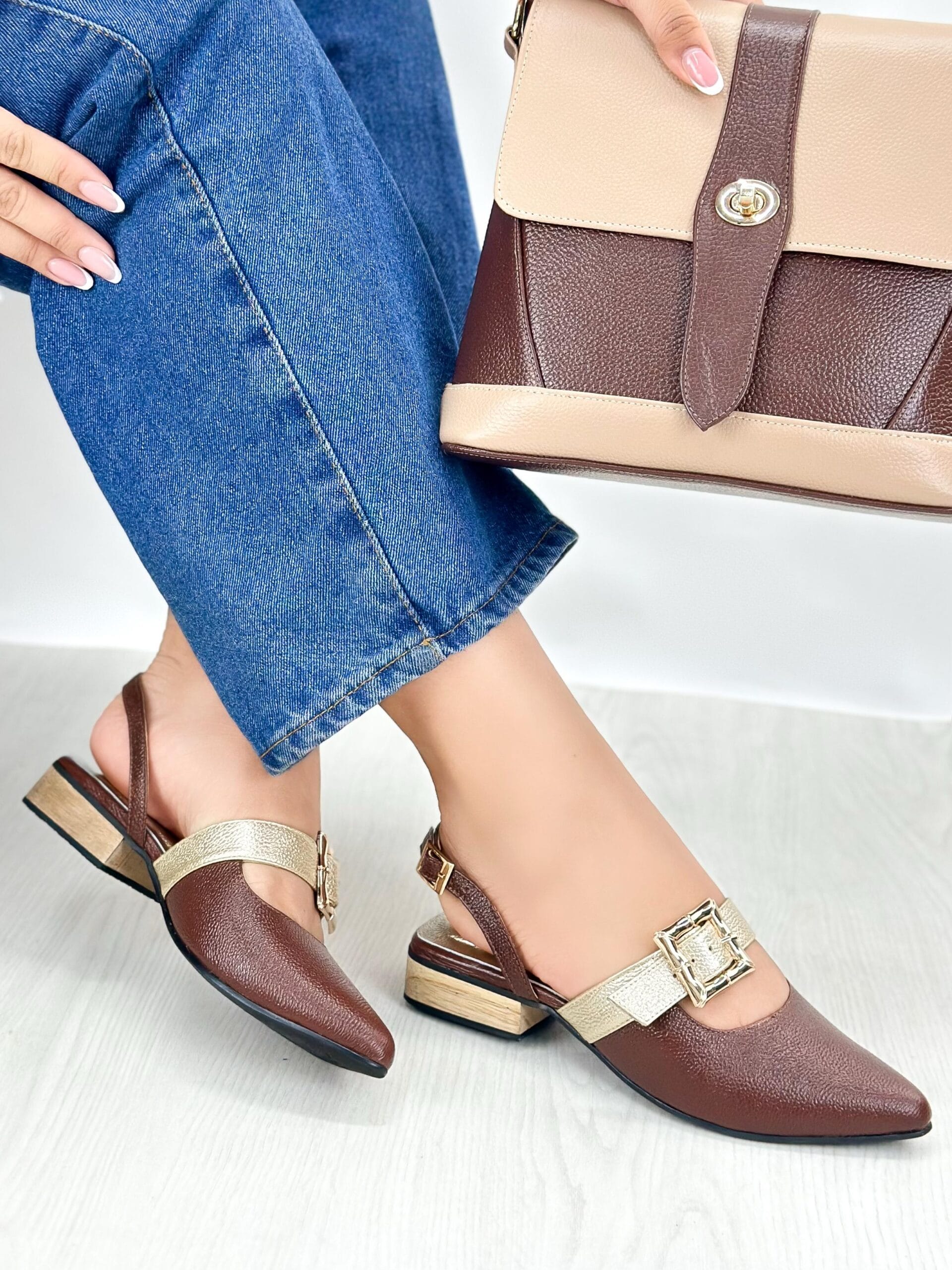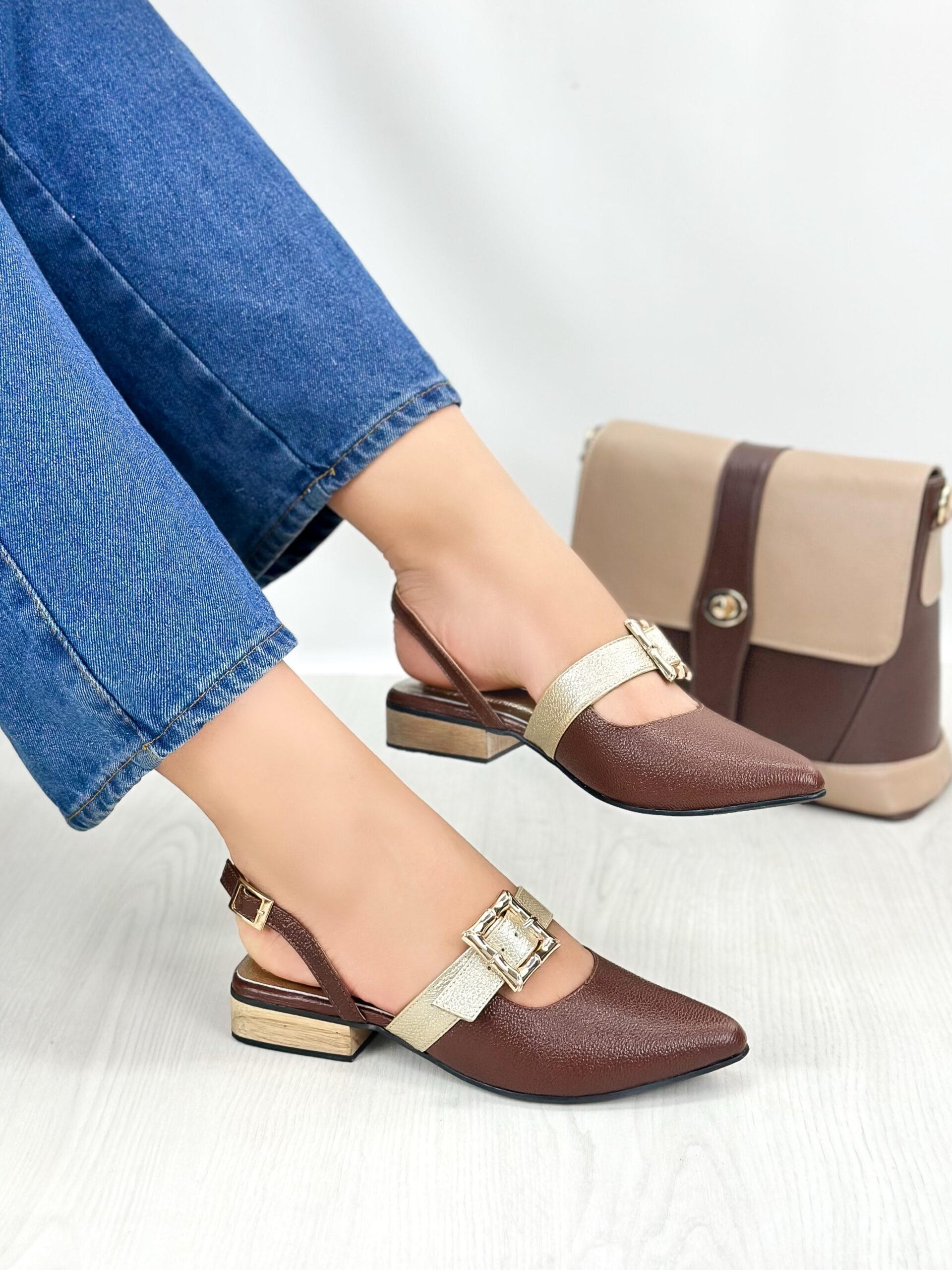 Tacones Marila con tacón bajo de 2.5 cm, ideales para resaltar tu estilo con comodidad en el día a día. Su diseño combina un elegante color café en tendencia con una correa superior dorada y una hebilla decorativa que añade un toque distintivo. Además, cuentan con una correíta trasera que permite un ajuste firme y seguro, haciendo de este calzado una opción moderna, funcional y con mucha personalidad.