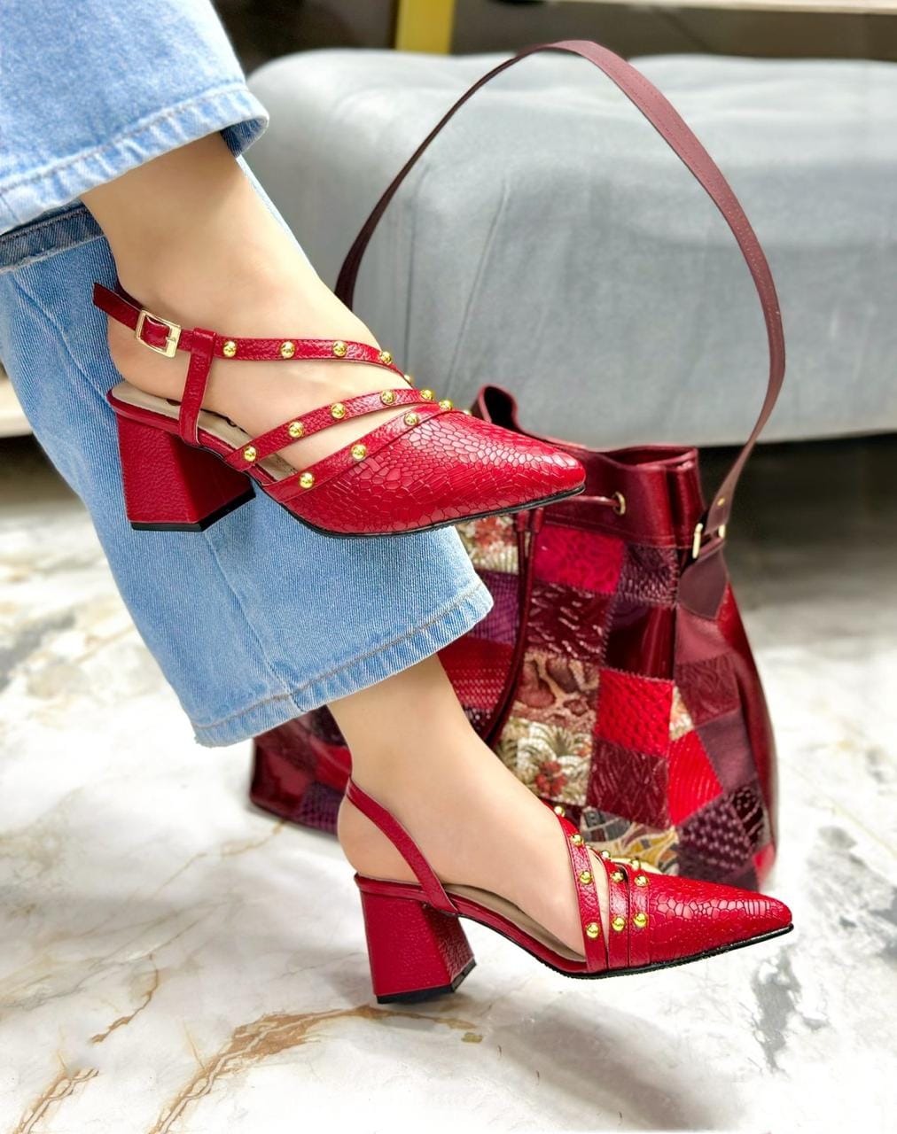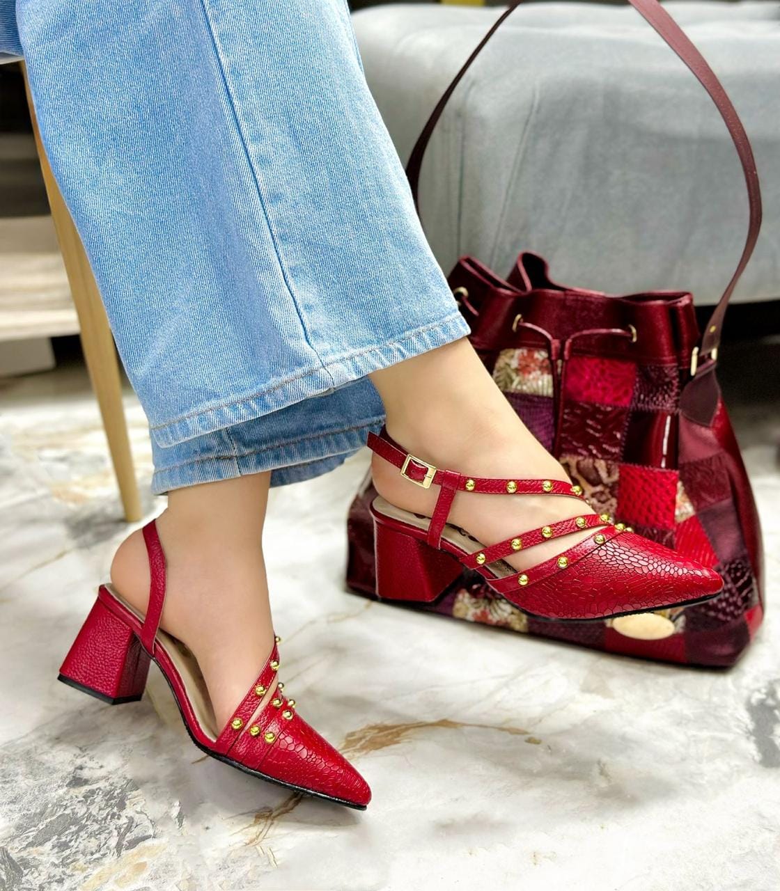 Los tacones Riley son la mezcla perfecta entre elegancia y modernidad. Están elaborados en cuero Baldimore con grabado, que resalta su textura sofisticada y distintiva. Su diseño incorpora tiras decoradas con taches Rojo, aportando un toque audaz y glamuroso que realza cualquier look.