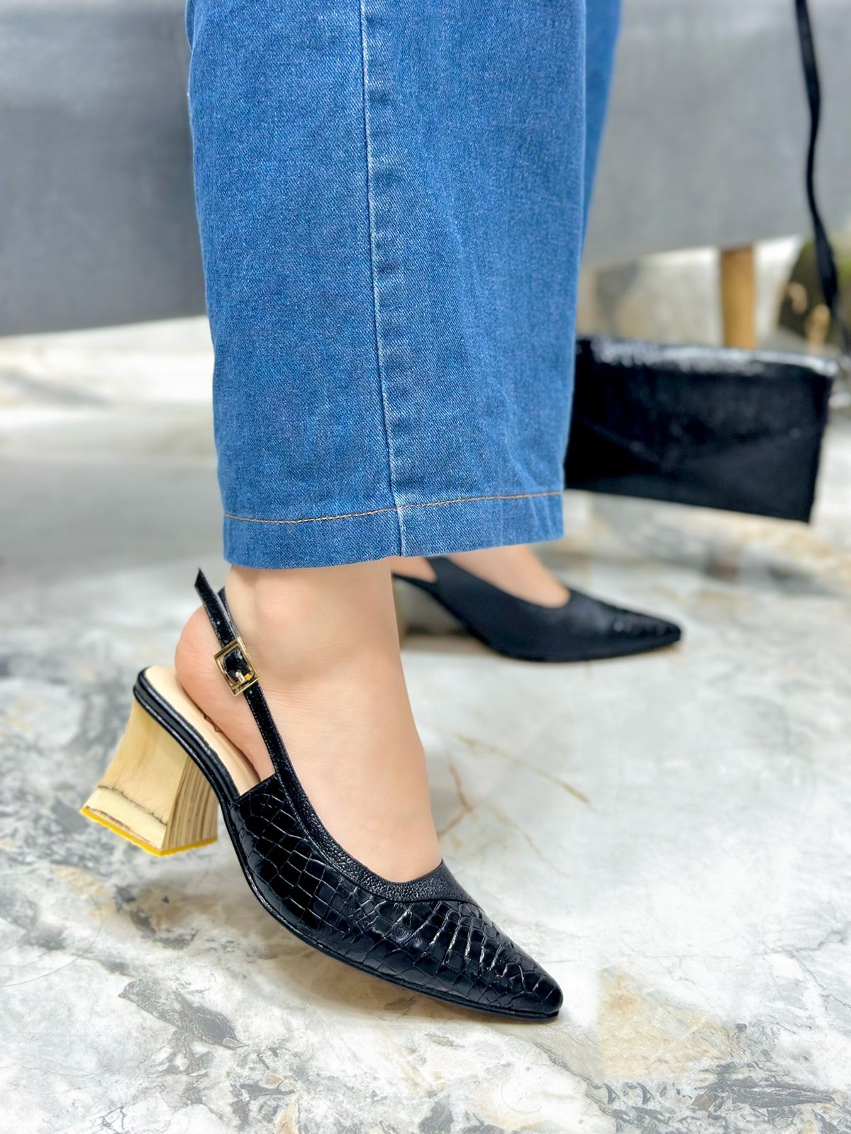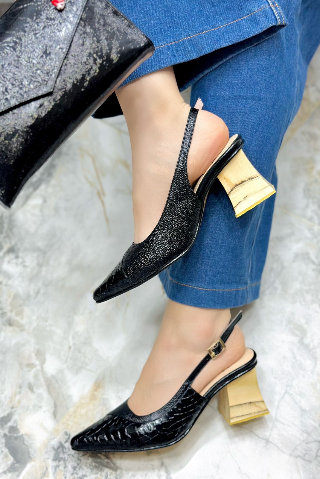 Tacones en cuero color Negro con elegante acabado en folia, que combinan a la perfección cuero liso por un lado y cuero grabado por el otro, aportando un diseño único y sofisticado. Cuentan con un tacón de 6.5 cm en material de madera que brinda altura, estabilidad y comodidad, ideales para complementar tus looks con un toque moderno y femenino.