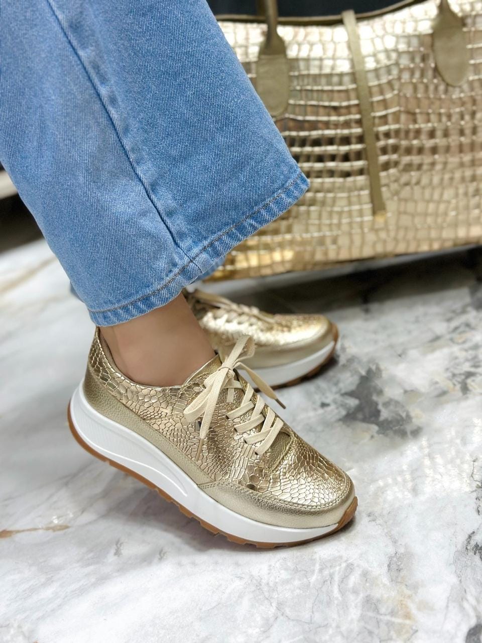 Eleva tu estilo con los tenis Akuza dorado en cuero, un calzado que fusiona lujo y comodidad. Su acabado metalizado con textura tipo reptil aporta un toque sofisticado y moderno, ideal para outfits casuales o elegantes. Cuentan con suela ergonómica, plantilla acolchada y un diseño que garantiza confort y presencia durante todo el día.