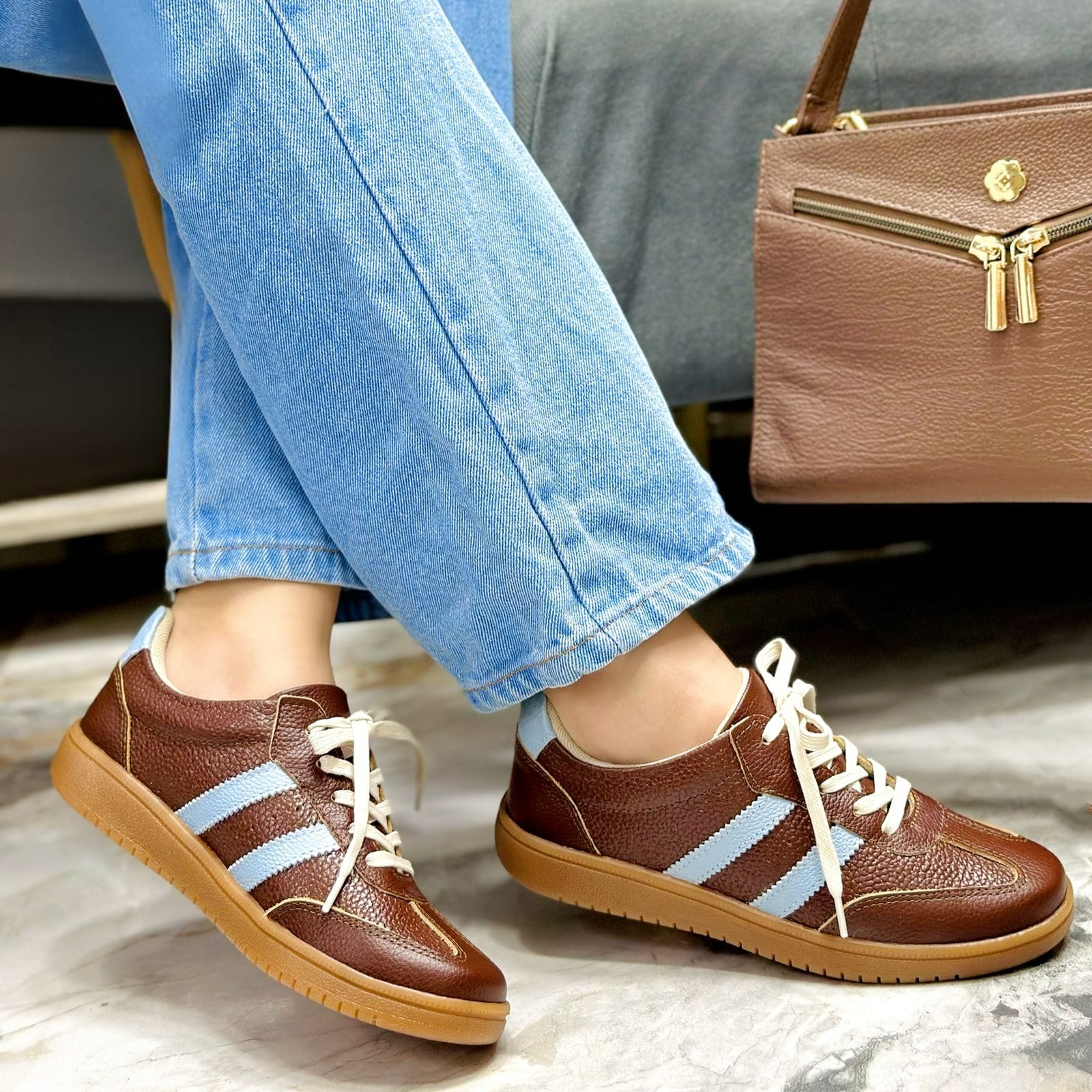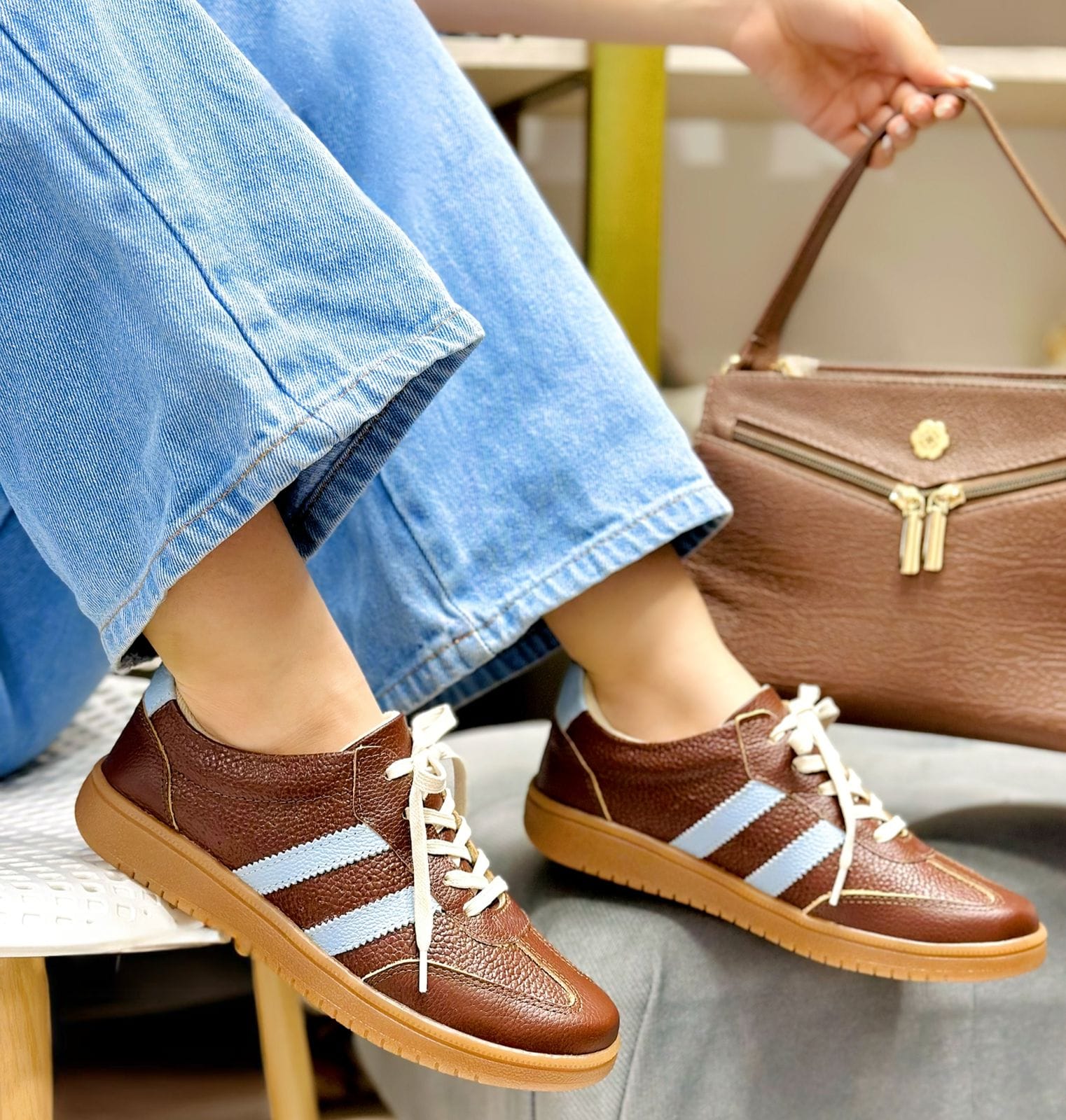 Los tenis Amanda en cuero Avellana combinan con lineas a los lados en color celeste estilo y comodidad en un diseño casual perfecto para el día a día. Con detalles en suela en color café, son ideales para quienes buscan un calzado versátil, duradero y con un toque moderno y fresco.