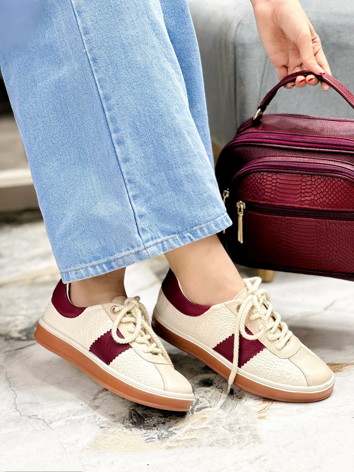 Los Tenis Angela destacan por su diseño único y sofisticado, elaborados en cuero genuino de tono Vinotinto que aporta un toque de elegancia y versatilidad a cualquier look. Sus detalles en cuero color crema en la parte delantera combina detalles artesanales con costuras delicadas y cordones trenzados que realzan su estilo moderno.