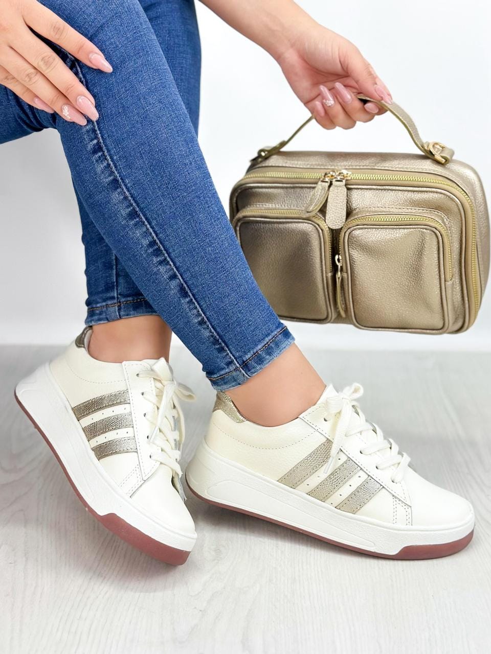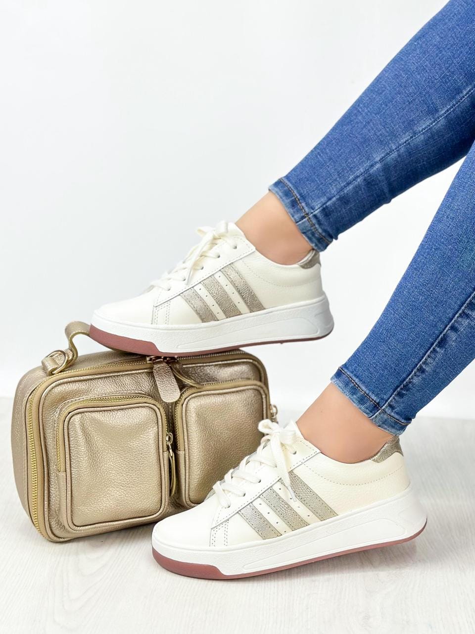 Los tenis Aria en color talco con líneas doradas están confeccionados en cuero de alta calidad, ofreciendo durabilidad y un acabado elegante. Su interior cuenta con espuma sintética que proporciona una comodidad excepcional al caminar. La combinación de talco y dorado les otorga un toque sofisticado, convirtiéndolos en la opción perfecta para cualquier ocasión. Con Aria, disfruta de estilo, confort y resistencia en cada paso.