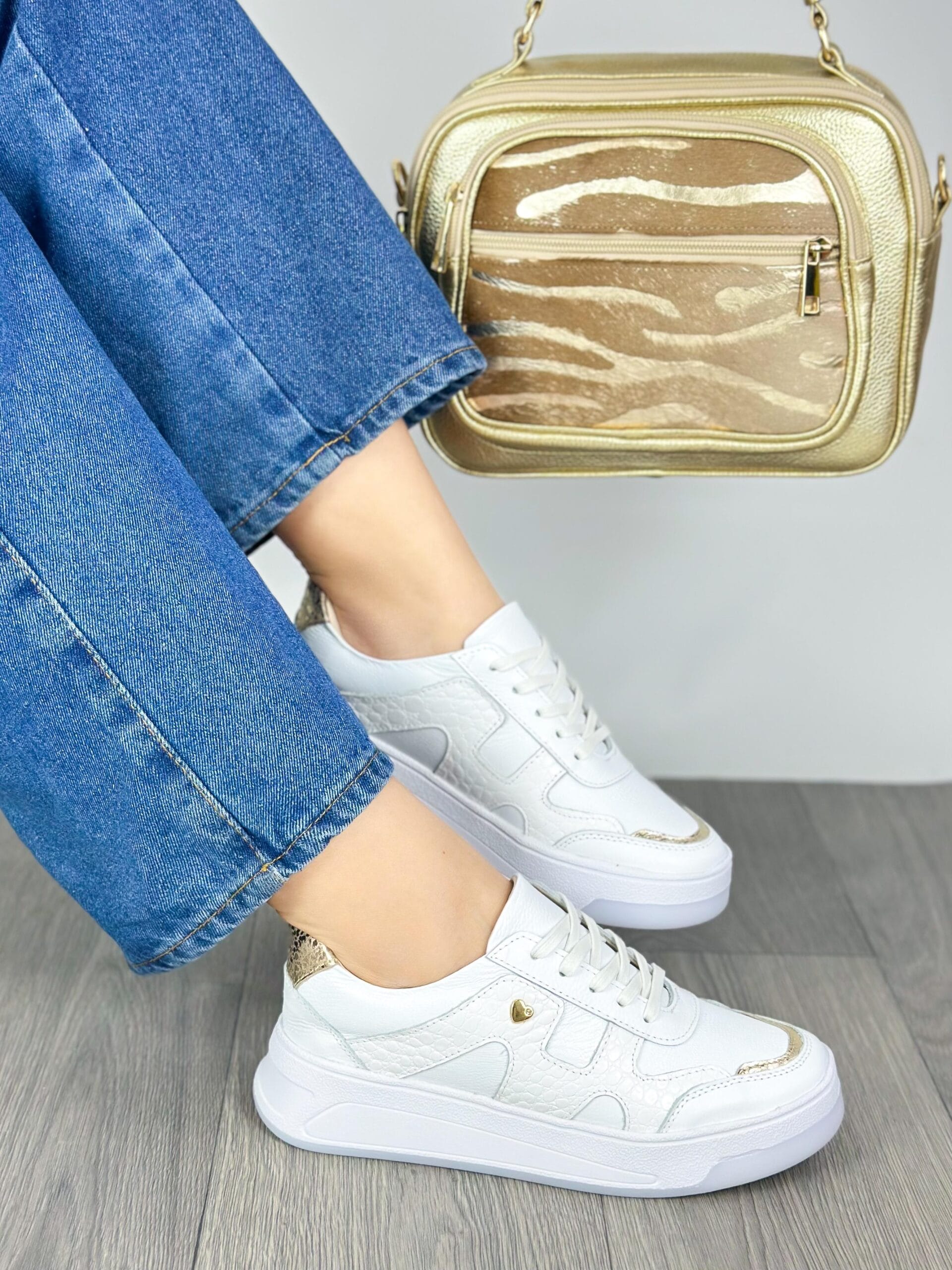 Tenis en color Blanco combinados con un elegante Dorado en cuero Vaporiano, diseñados para un look fresco y versátil. Confeccionados en materiales de alta calidad, estos tenis ofrecen una apariencia sofisticada y moderna, ideal para cualquier ocasión. La combinación de tonos neutros añade un toque único de estilo, haciendo que sean fáciles de combinar y perfectos para quienes buscan comodidad y elegancia en cada paso.