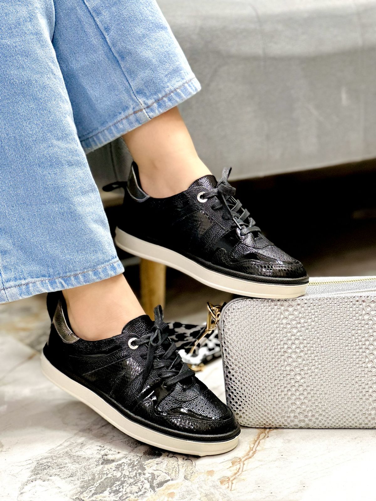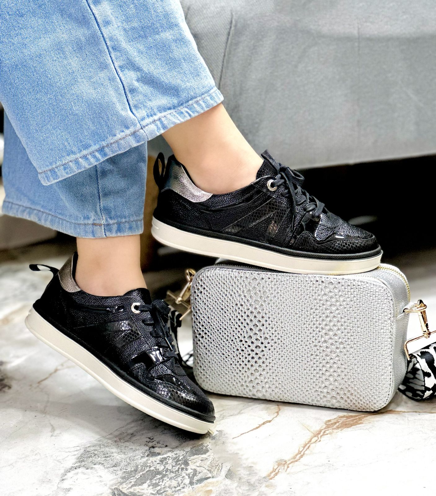 Los tenis Bella son la combinación perfecta entre elegancia y confort. Su diseño en color negro con detalles plomo y toques en charol los convierte en el complemento ideal para elevar tus outfits casuales o urbanos. Fabricados en cuero de alta calidad, ofrecen un ajuste cómodo y una suela ligera que te acompaña en cada paso con estilo. Perfectos para quienes buscan un look moderno, versátil y con un toque de brillo. ✨