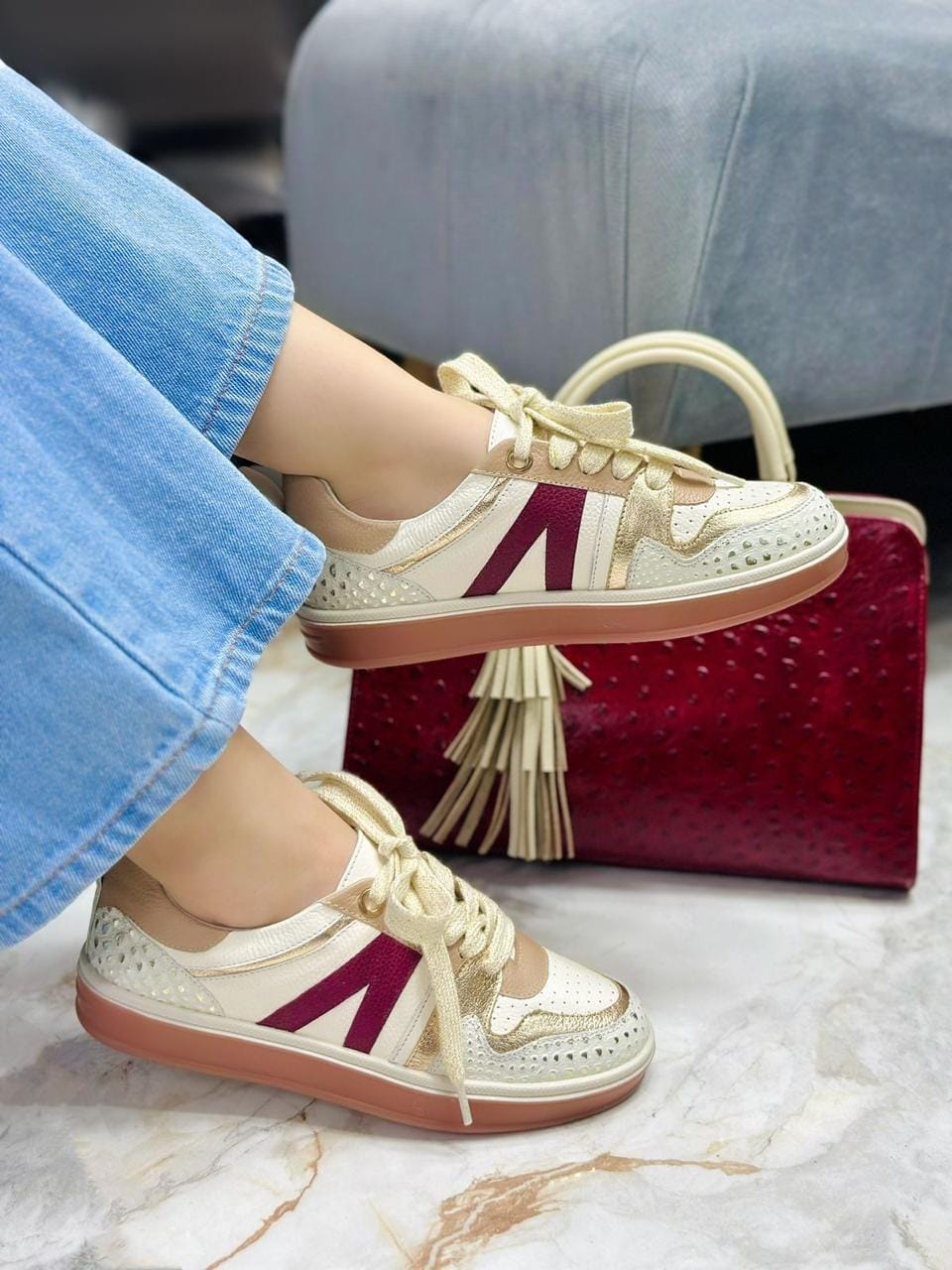 Los tenis Bella en color talco son la combinación perfecta entre elegancia y confort. Su diseño único destaca por una base en tono neutro que se realza con una delicada folia dorada y piezas en color vinotinto, creando un contraste moderno y sofisticado. Fabricados con materiales de alta calidad, ofrecen suavidad, ligereza y un ajuste ideal para el día a día. Perfectos para quienes buscan un calzado versátil que combine con cualquier look, desde outfits casuales hasta más chic. Con los tenis Bella, cada paso refleja estilo, confianza y un toque de lujo.
