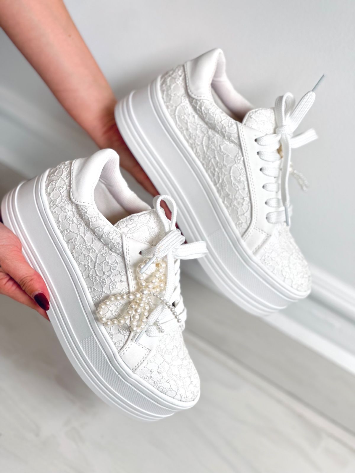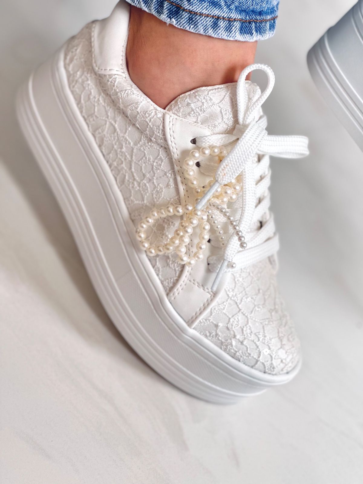 Tenis en color blanco hueso, fabricados en material sintético de alta calidad con delicado bordado que aporta textura y realce únicos. Su diseño con plataforma alta combina comodidad y estilo, mientras que los acabados en encaje añaden un toque elegante y moderno. Ideales para complementar looks casuales o dar un aire sofisticado a ocasiones especiales, estos tenis son la fusión perfecta entre moda y confort