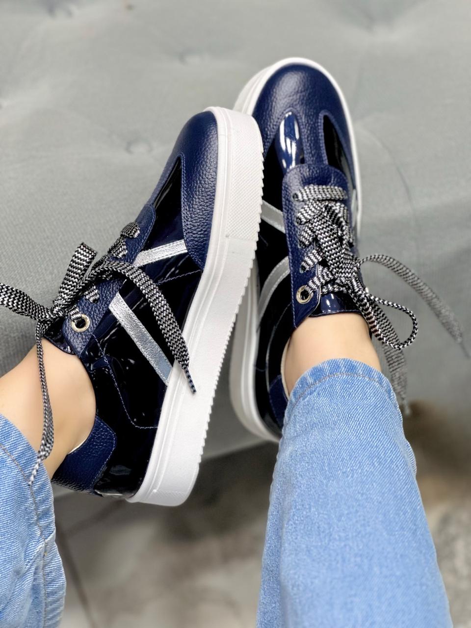 Los tenis Blaze Charol Azul Plata, Tenis elegante y contemporáneo elaborado en cuero charol color azul oscuro, ideal para quienes buscan un calzado que combine estilo y sofisticación. Los sutiles acentos plateados a los costados aportan un contraste moderno y llamativo, mientras que los cordones decorativos, de diseño fino y estilizado, elevan el look con un toque distintivo. Forro interior en material sintético que brinda confort durante todo el día. Perfecto para destacar en cualquier ocasión, ya sea casual o semi-formal.