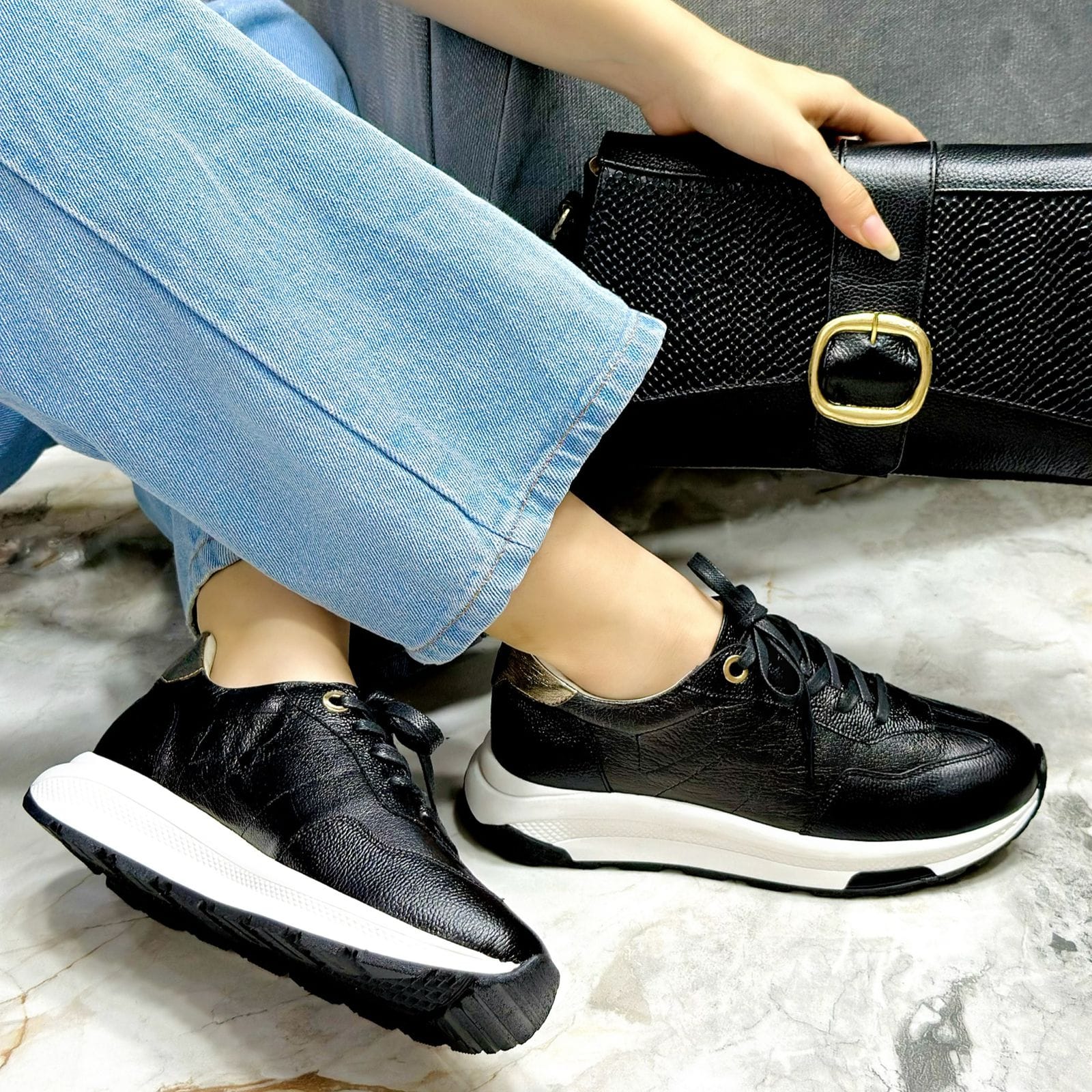 Los tenis Cassie de cuero negro con detalle dorado en la parte trasera combinan elegancia, comodidad y estilo contemporáneo. Fabricados en cuero genuino de alta calidad, ofrecen una textura suave, resistente y un diseño versátil ideal para cualquier ocasión. Su suela ligera y ergonómica garantiza confort durante todo el día, mientras que el contraste entre el negro clásico y el dorado metálico aporta un toque moderno y sofisticado. Perfectos para lucir con confianza y distinción en cada paso.