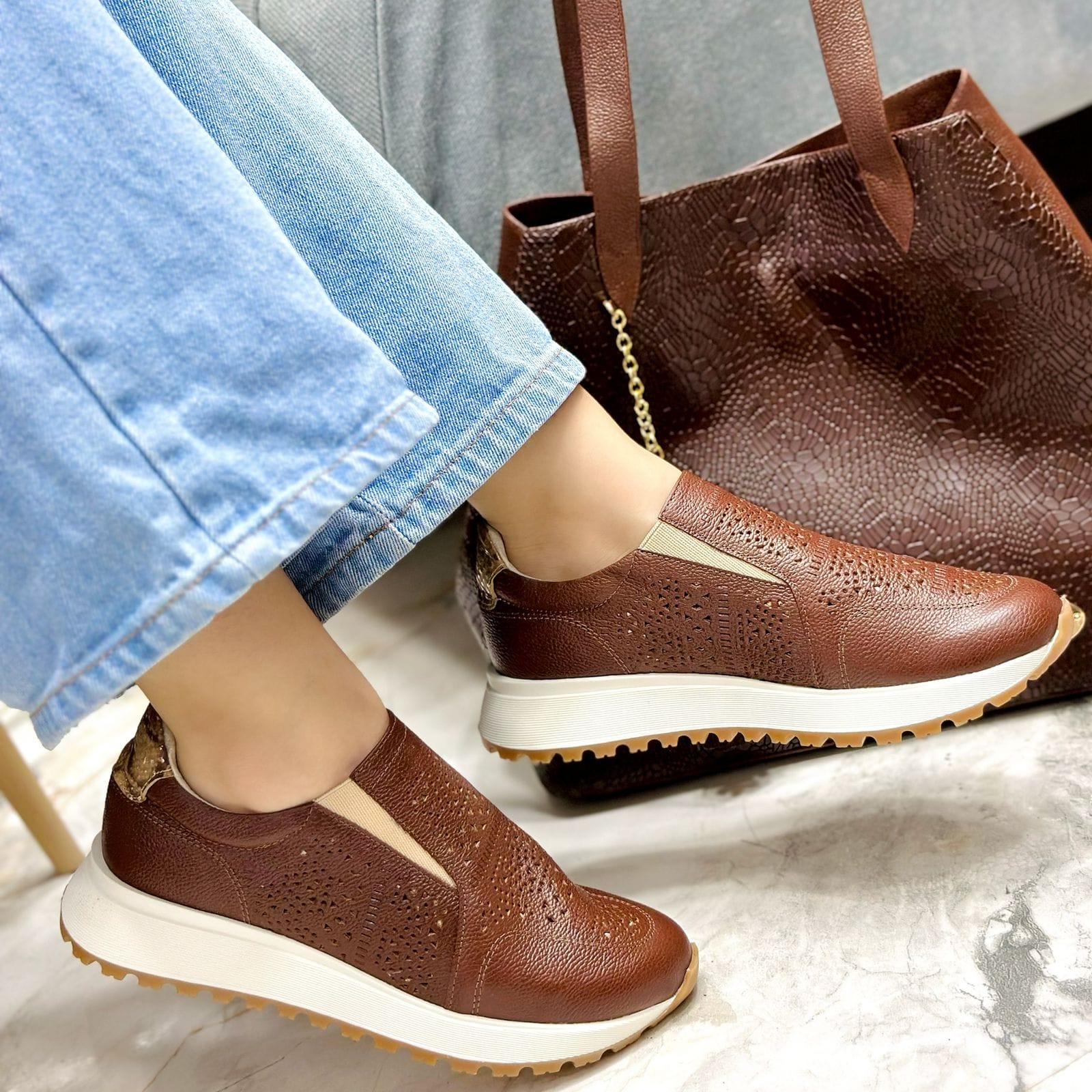 Los tenis Celeny en color Avellana combinan diseño, comodidad y estilo contemporáneo. Elaborados en cuero genuino con delicadas perforaciones que favorecen la ventilación. Su diseño sin cordones y con un pequeño elástico a los lados los hace de fácil postura, ideales para quienes buscan practicidad y elegancia en un solo calzado.