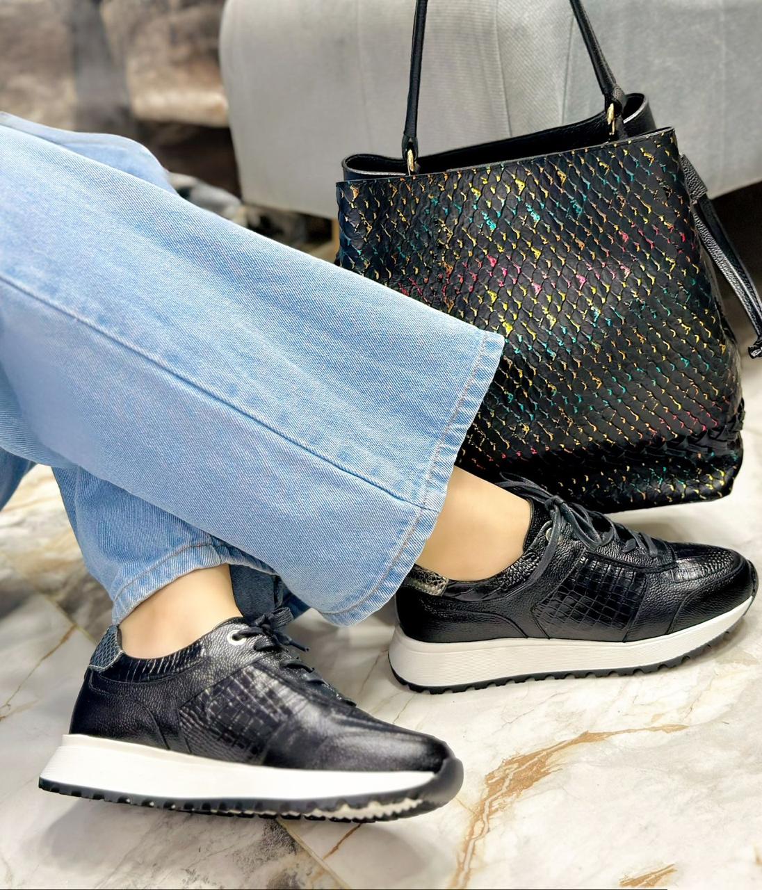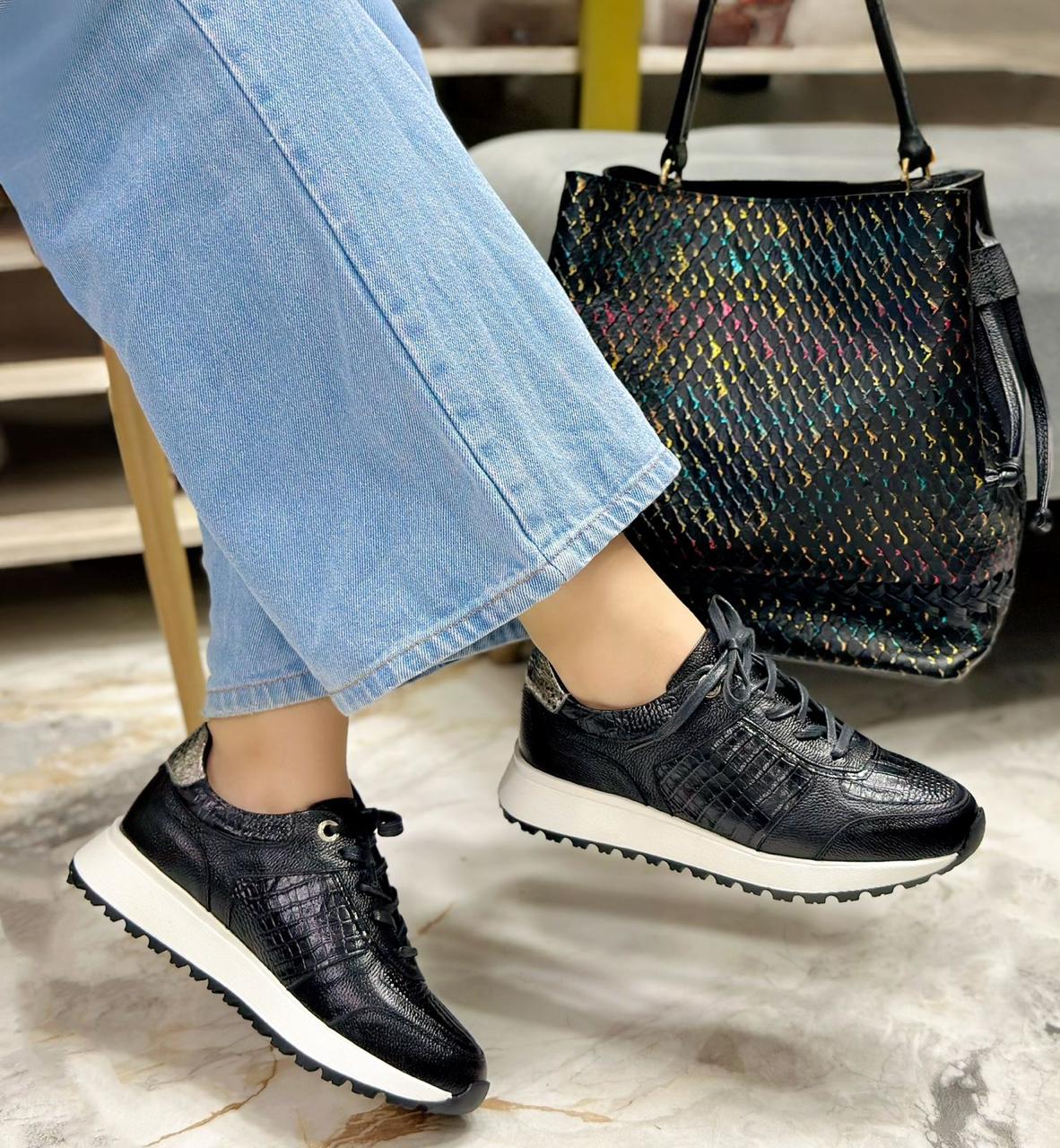 Los tenis Coraline combinan estilo y comodidad en un diseño elaborado en cuero de alta calidad. Su tono negro con detalle plateado en la parte trasera aporta un toque moderno y versátil, mientras que los laterales en cuero grabado rectil añaden textura y elegancia.