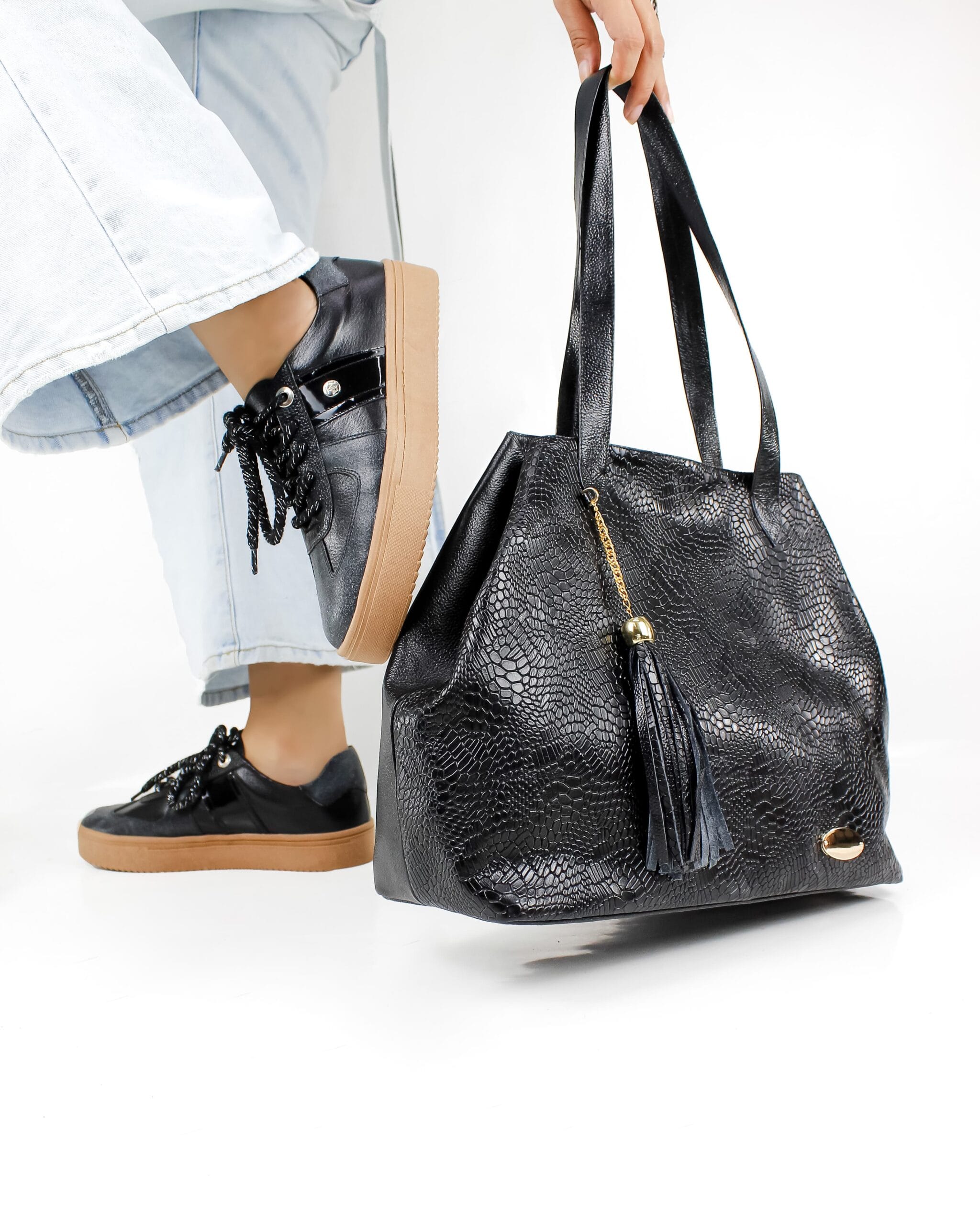 Los tenis Dafne en color negro están diseñados para destacar con elegancia y estilo. Su exterior en cuero de alta calidad garantiza durabilidad y confort, mientras que su diseño totalmente negro ofrece versatilidad para combinar con cualquier outfit. A ambos lados, un toque sutil de charol añade un brillo sofisticado que eleva el diseño. La suela en tono café crea un contraste moderno que resalta el carácter neutro del zapato, haciéndolo perfecto para el día a día o eventos casuales con estilo.