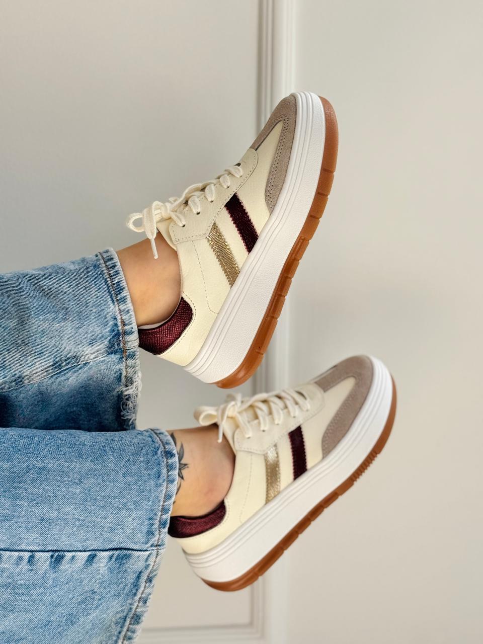 Tenis casual femenino elaborado en cuero, con una suela alta de plataforma en tono blanco con base caramelo que aporta un look moderno y cómodo. El diseño combina distintos tonos y texturas: la puntera está hecha en cuero tipo gamuza color taupe, mientras que los laterales y lengüeta son en cuero liso tono crema.