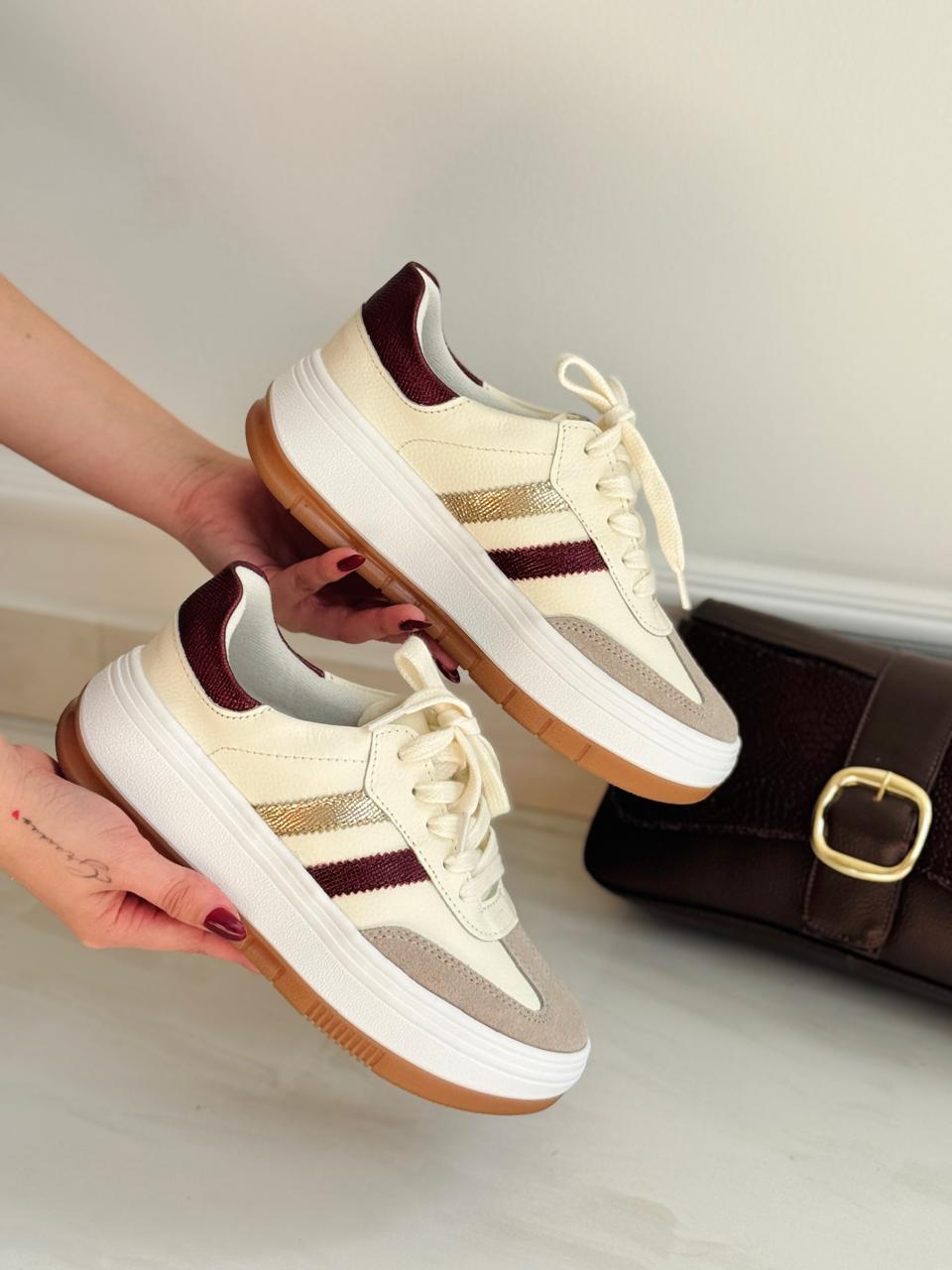 Presenta dos franjas decorativas a los costados: una en cuero vino tinto texturizado con brillo y otra en tono dorado con acabado metálico suave. La parte trasera del calzado incluye un refuerzo en cuero color vino tinto brillante, haciendo juego con las franjas laterales.