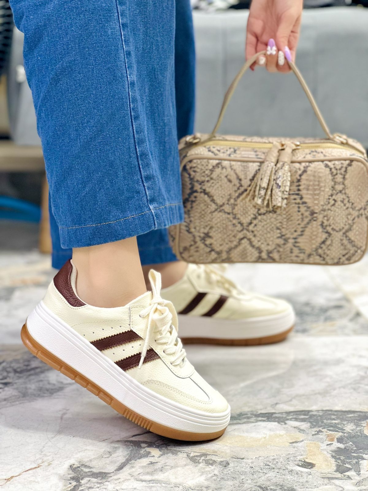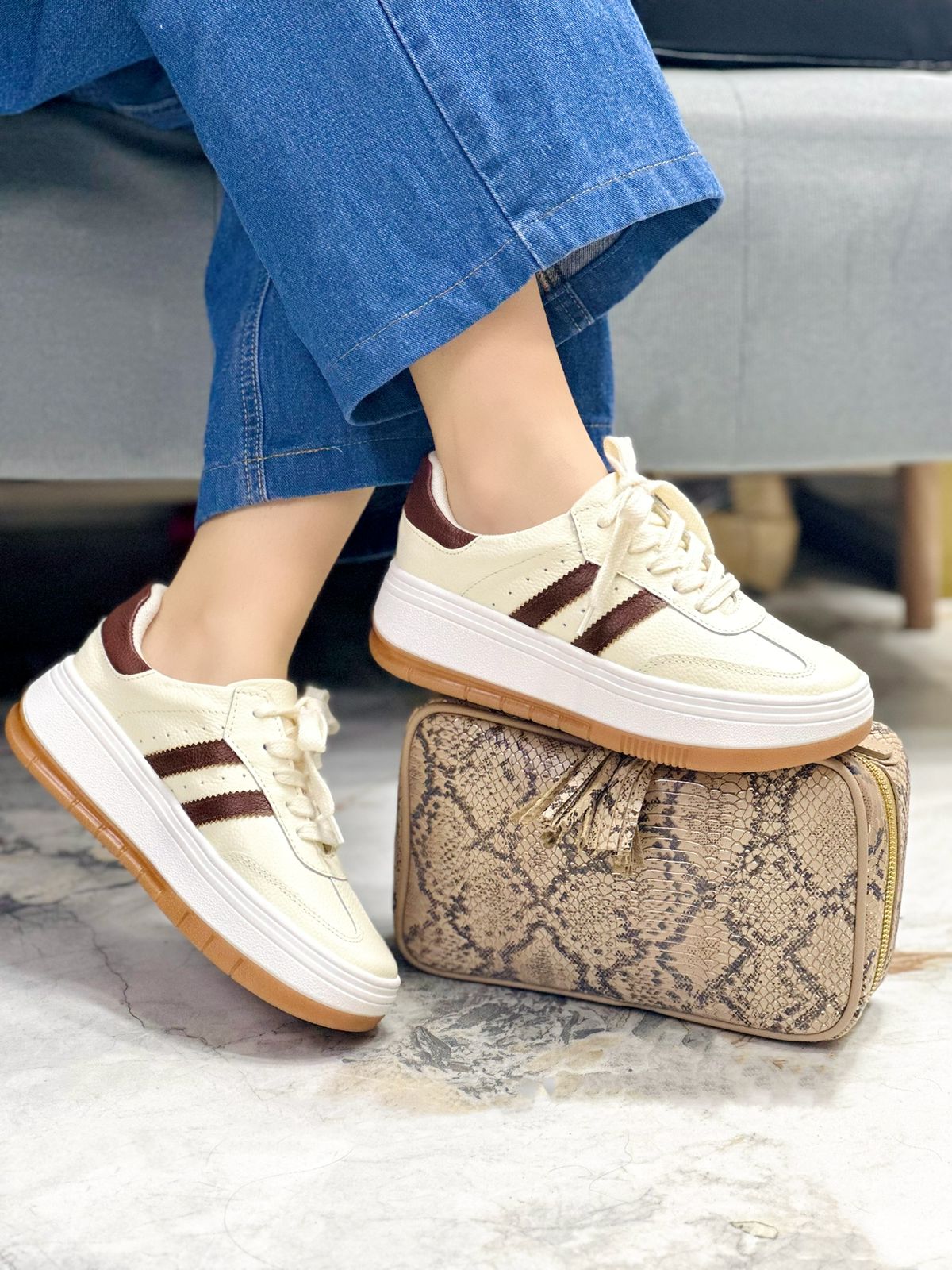 Los tenis Dalia combinan estilo y comodidad en un diseño moderno y sofisticado. Están elaborados en cuero Talco de acabado en avellana, que aporta un toque elegante y llamativo sin perder versatilidad. Su plataforma ofrece una pisada suave y un extra de altura, mientras que la suela en tono caramelo brinda excelente tracción y un look urbano.