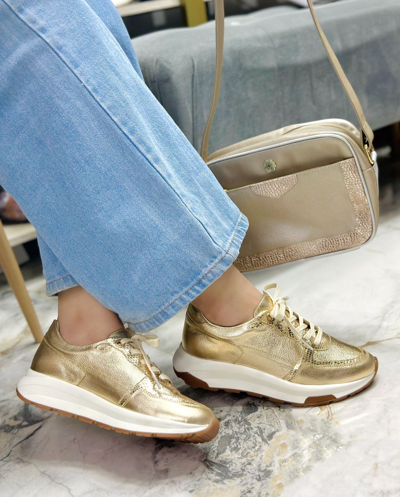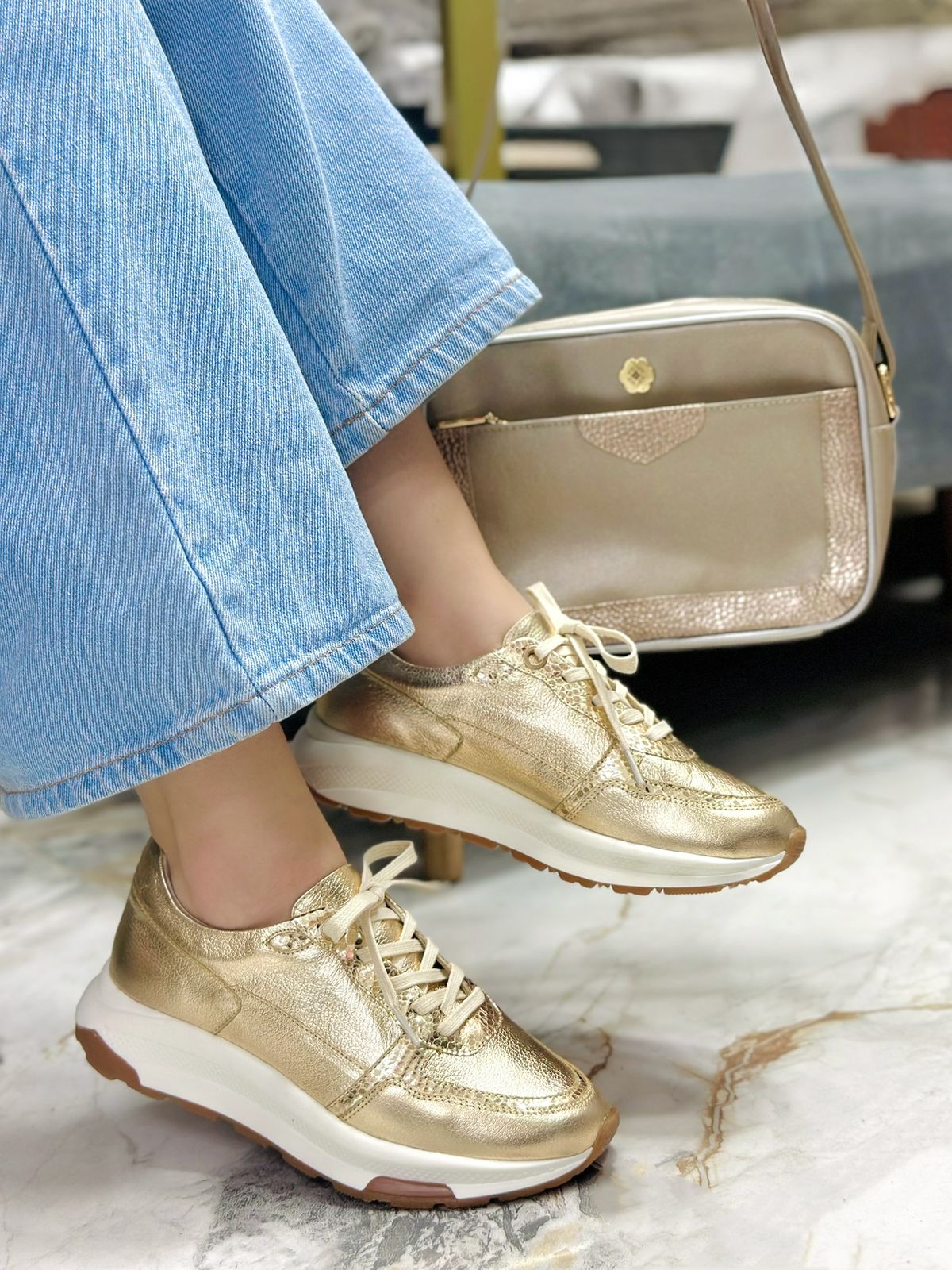 Los tenis Darly están fabricados en cuero en un elegante tono dorado, ideales para quienes buscan estilo y confort en un mismo diseño. Su combinación de texturas en el cuero resalta su sofisticación, mientras que su interior cuenta con abullonado en espuma, brindando una sensación de máxima comodidad en cada paso. La suela blanca con base color miel complementa perfectamente el diseño, logrando un look moderno y versátil para cualquier ocasión.