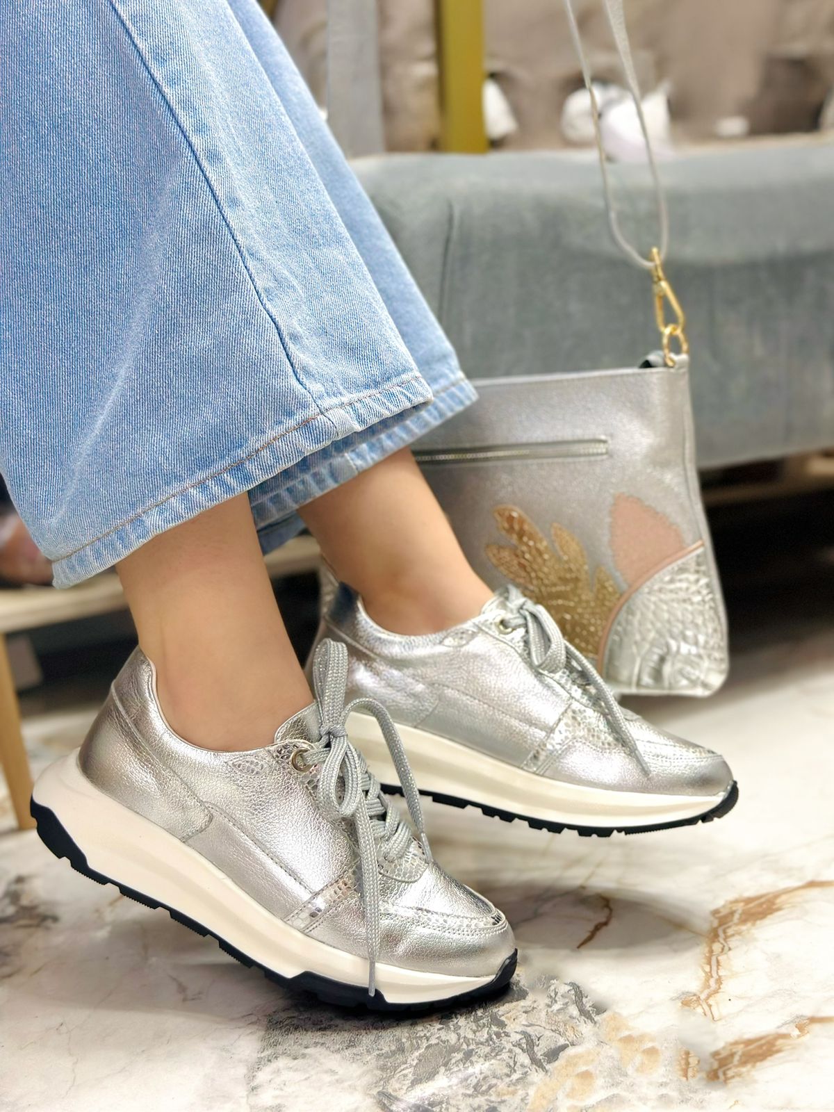 Los tenis Darly están fabricados en cuero en un elegante tono Plateado, ideales para quienes buscan estilo y confort en un mismo diseño. Su combinación de texturas en el cuero resalta su sofisticación, mientras que su interior cuenta con abullonado en espuma, brindando una sensación de máxima comodidad en cada paso. La suela blanca con base color miel complementa perfectamente el diseño, logrando un look moderno y versátil para cualquier ocasión.