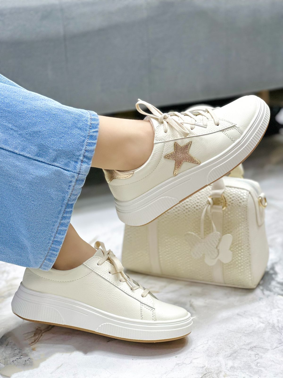 Los tenis Destello en color Talco son una fusión perfecta de estilo, comodidad y elegancia. Elaborados en cuero de alta calidad, destacan por su textura suave y su acabado impecable, que combina la calidez del tono dorado. Este contraste aporta un toque sofisticado y moderno que los convierte en el complemento ideal para cualquier ocasión.
