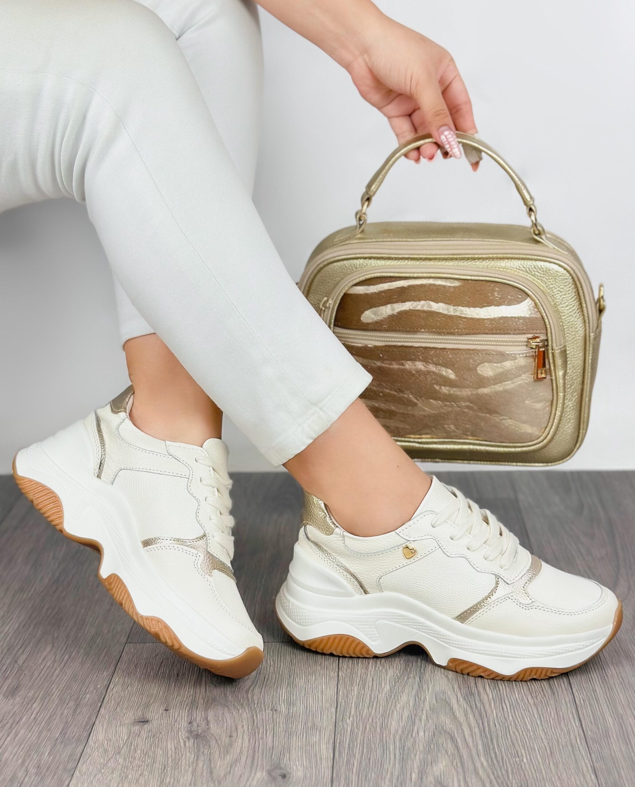 Los Tenis Dolce Talco Dorado Evoltys son ideales para quienes buscan un diseño moderno y elegante. Fabricados en cuero de alta calidad, su color blanco se complementa perfectamente con sutiles detalles en cuero a ambos lados, aportando un contraste sofisticado y atemporal. En su interior, cuentan con un abullonado en material sintético que ofrece una comodidad inigualable durante todo el día. Estos tenis combinan estilo y versatilidad, siendo perfectos para llevar con looks casuales o más formales, asegurando siempre una pisada cómoda y con mucho estilo. ¡Un diseño que resalta por su simplicidad y detalles únicos