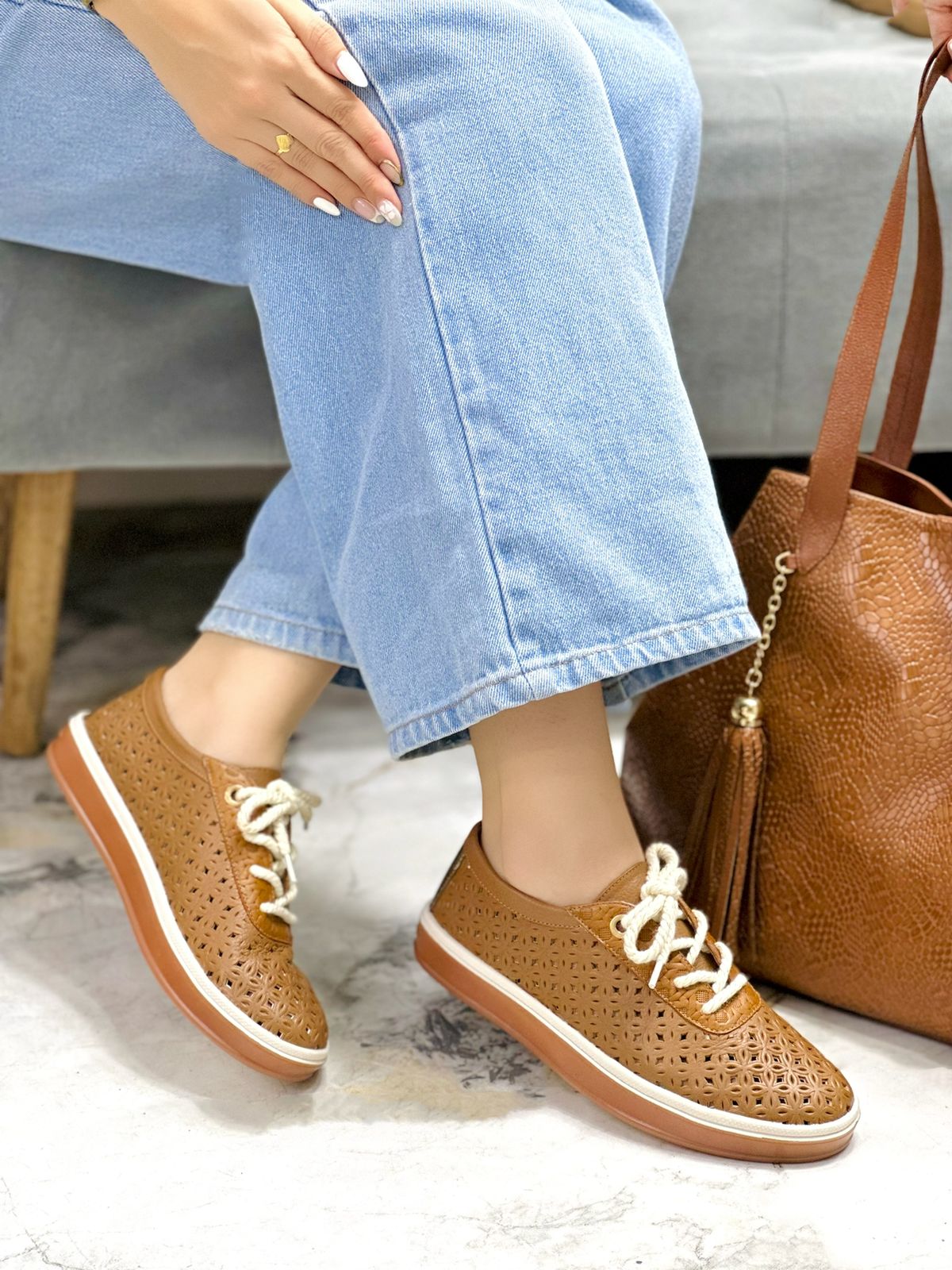Los tenis Emma Miel están elaborados en cuero de alta calidad, con diseño perforado que aporta frescura y elegancia. En la parte trasera cuentan con un grabado dorado que añade un toque sofisticado. Su tono miel, agujetas claras y suela cómoda los hacen ideales para el uso diario, combinando durabilidad, confort y estilo casual.