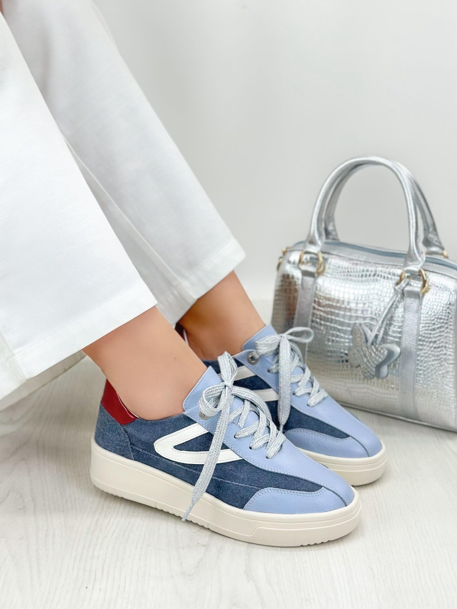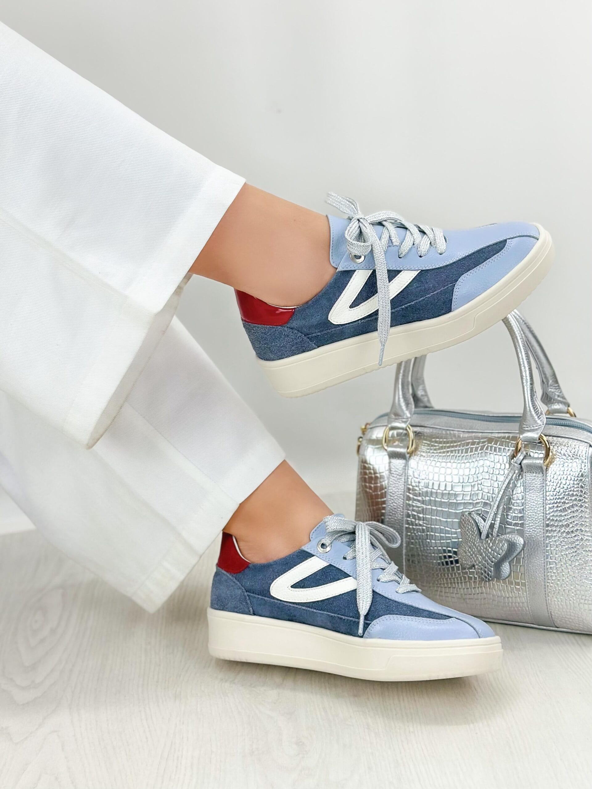 Los tenis Fiorella Azul Rojo Carnaza son unos tenis de diseño vibrante y cómodo, fabricado en cuero de alta calidad que garantiza durabilidad y estilo. La parte superior en color celeste aporta frescura y originalidad, combinada con laterales en tono azul jean que le dan un aire moderno y versátil. El detalle en la parte trasera en color rojo añade un toque audaz que resalta el diseño. Los cordones plateados completan el look con un acabado elegante y llamativo. Con un interior suave y confortable, este modelo es ideal para quienes buscan estilo y comodidad en cada paso.