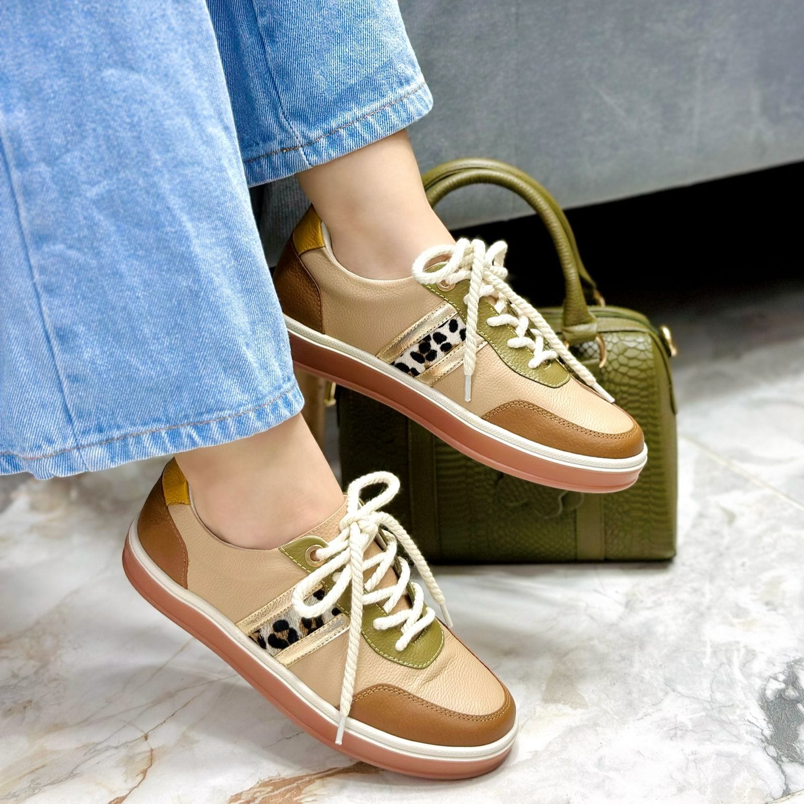 Los tenis Gwen en tono capuchino están diseñados para destacar con estilo y comodidad. Confeccionados en cuero de alta calidad, combinan tonos cálidos y modernos: una base capuchino, detalles en café al frente, piezas en verde oliva y un toque elegante de dorado con print animal entre las líneas laterales. Su suela baja proporciona confort durante todo el día, mientras que los colores neutros y naturales los convierten en el complemento perfecto para outfits casuales o looks más atrevidos. Ideales para quienes buscan versatilidad y diseño en un solo par