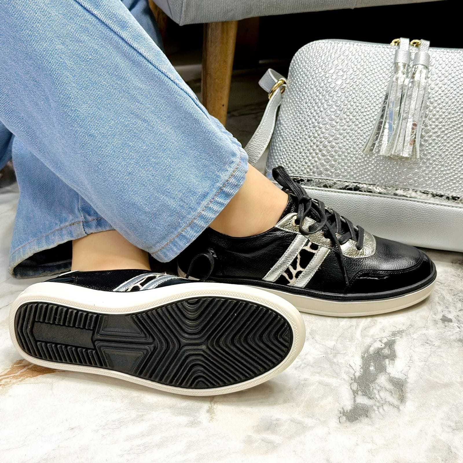 Los tenis Gwen en color negro son la mezcla perfecta entre estilo urbano y detalles sofisticados. Están diseñados con un acabado en charol en la parte delantera que aporta un toque elegante, mientras que los laterales presentan dos líneas plateadas que contrastan con una franja central de print animal, creando un diseño llamativo y moderno. Su suela baja garantiza máxima comodidad para el uso diario, sin sacrificar el estilo. Perfectos para combinar con jeans, pantalones casuales o incluso looks más atrevidos