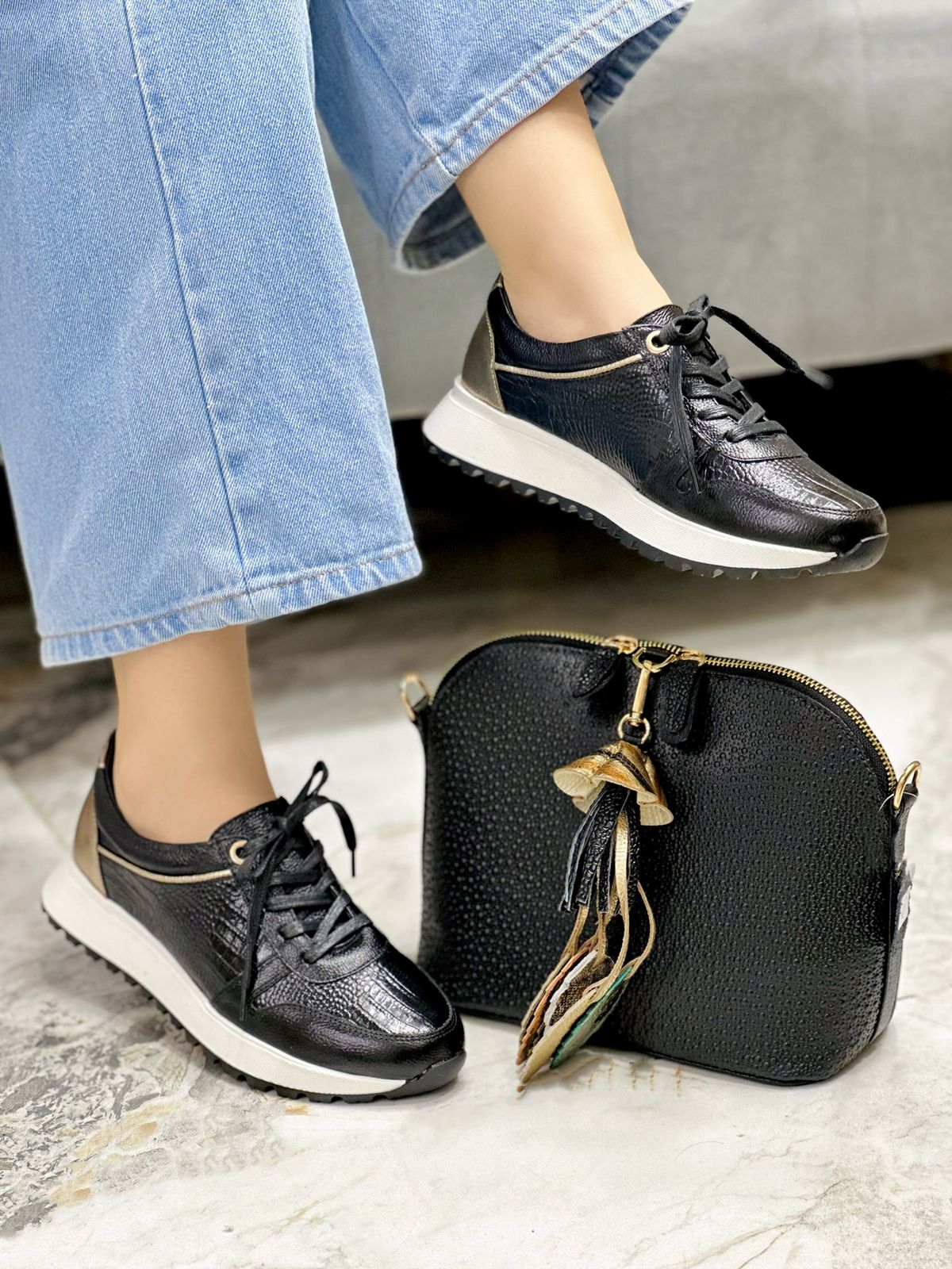 Incorporan delicados detalles en color dorado luna, presentes en el talón y en finas líneas decorativas, que aportan un toque sofisticado sin perder su esencia casual. La suela liviana y con buen agarre complementa perfectamente el diseño, ofreciendo confort y estabilidad.