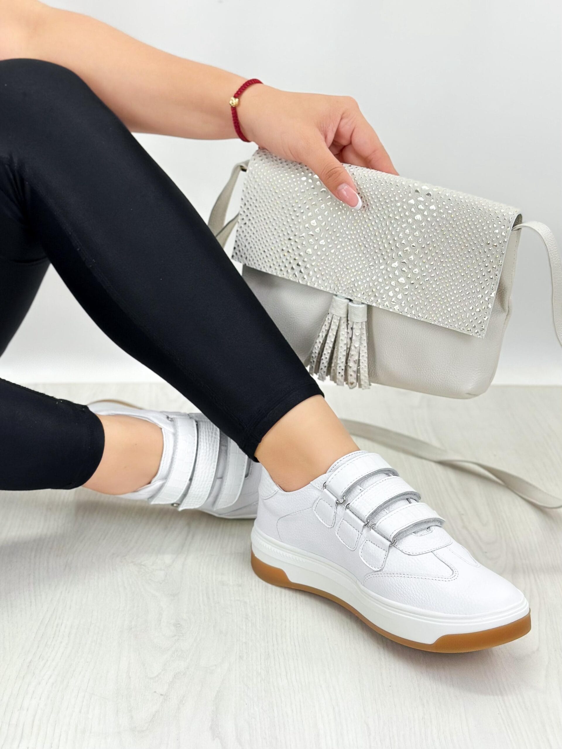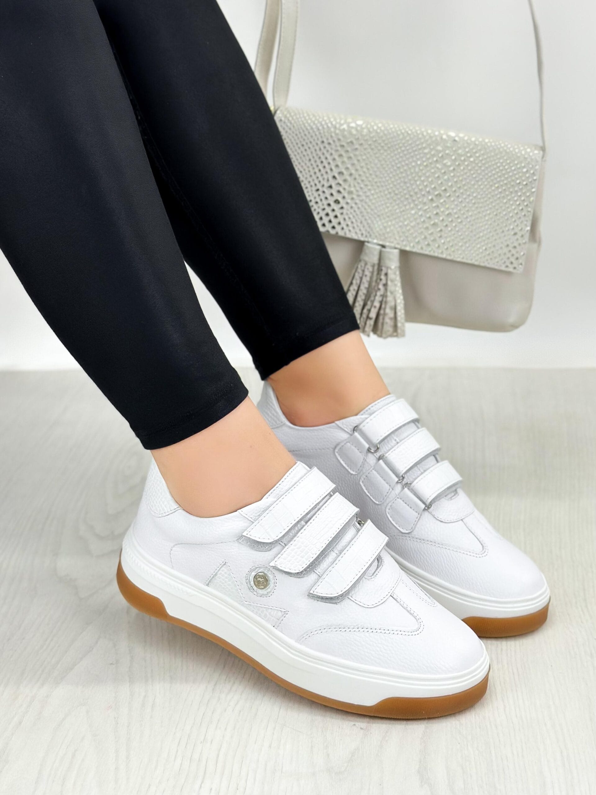 Los tenis Irina en color Blanco combinan estilo, practicidad y comodidad en un solo diseño. Su sistema de cierre con velcro elimina la necesidad de cordones, facilitando un ajuste rápido y seguro, ideal para el ritmo acelerado del día a día. Están elaborados en cuero de alta calidad, lo que garantiza durabilidad y un look sofisticado. En su interior, cuentan con un suave abullonado  que brinda una sensación de confort superior en cada paso, haciéndolos perfectos para el uso diario sin sacrificar estilo ni bienestar.